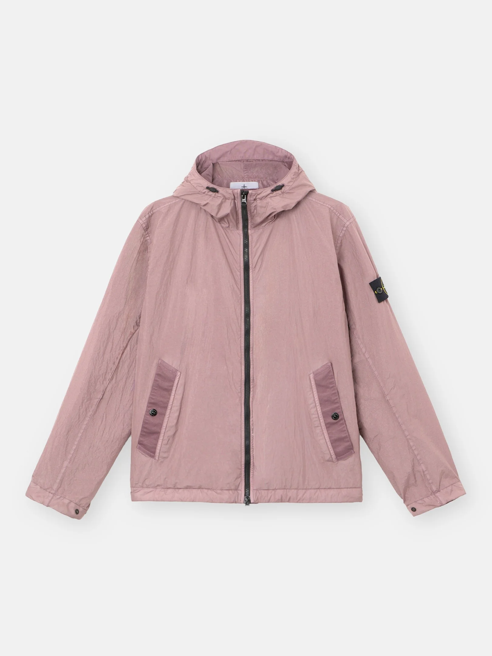 Hooded jacket in light recycled nylon rep with a crinkled appearance, featuring snap-fastened pockets, adjustable snap cuffs, and a two-way zipper. Garment dyed with anti-drop. FABRIC RESEARCH AND TREATMENT Hooded jacket in a light recycled nylon rep with an ultra-tight weaving construction. The resin coating of its inner face makes it wind resistant and mildly water resistant. Due to the resin treating of the material, the color penetrates unevenly into the material, lending a crinkled appearance to the surface. Garment dyed with the addition of a special anti-drop agent. STYLE AND FIT Hood with shaped visor and fixed elasticated drawcord with stoppers. Angled welt hand pockets with tape trim and snap. Stone Island badge on left sleeve. Adjustable cuffs with snap. Elasticated drawcord at bottom hem. Two-way zipper fastening with internal nylon tape placket. COMPOSITION AND CARE External Fabric: 100% Polyamide / Nylon Coating: 100% Polyurethanic Resin Lining: 100% Polyamide / Nylon Hood Lining: 100% Polyamide / Nylon
