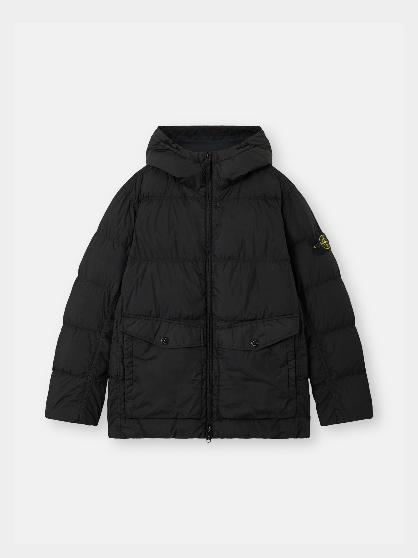 Hooded down jacket in recycled nylon rep whose inner resin coating makes the garment wind resistant with a crinkled appearance, featuring double hand pockets, elasticated inner cuffs, and two-way zipper. FABRIC RESEARCH AND TREATMENT Hooded down jacket in a light recycled nylon rep with an ultra-tight weaving construction. The resin coating of its inner face makes it wind resistant and mildly water resistant. Due to the resin treating of the material, the color penetrates unevenly into the material, lending a crinkled appearance to the surface. The piece is padded with the finest feathers specifically treated to withstand the garment dyeing procedure. RDS - Responsible Down Standard certified. STYLE AND FIT Padded hood with drawcord. Double hand pockets: one with top entrance, triangular flap, and snap; second standing pocket with hidden snap. Inner pocket with button and Compass logo embroidery. Stone Island badge on left sleeve. Elasticated inner cuffs. Drawcord at hem. Hidden two-way zipper fastening with one snap on inner placket. COMPOSITION AND CARE Garment: 100% Polyamide / Nylon. Coating: 100% Polyurethanic Resin. Lining: 100% Polyamide / Nylon. Hood Lining: 100% Polyamide / Nylon. Garment Detail Padding: 100% Polyester. Garment Padding: Duck Down (Minimum 80% Down) 80% Duck Down 20% Duck Feather. Contains Non-textile Parts Of Animal Origin
