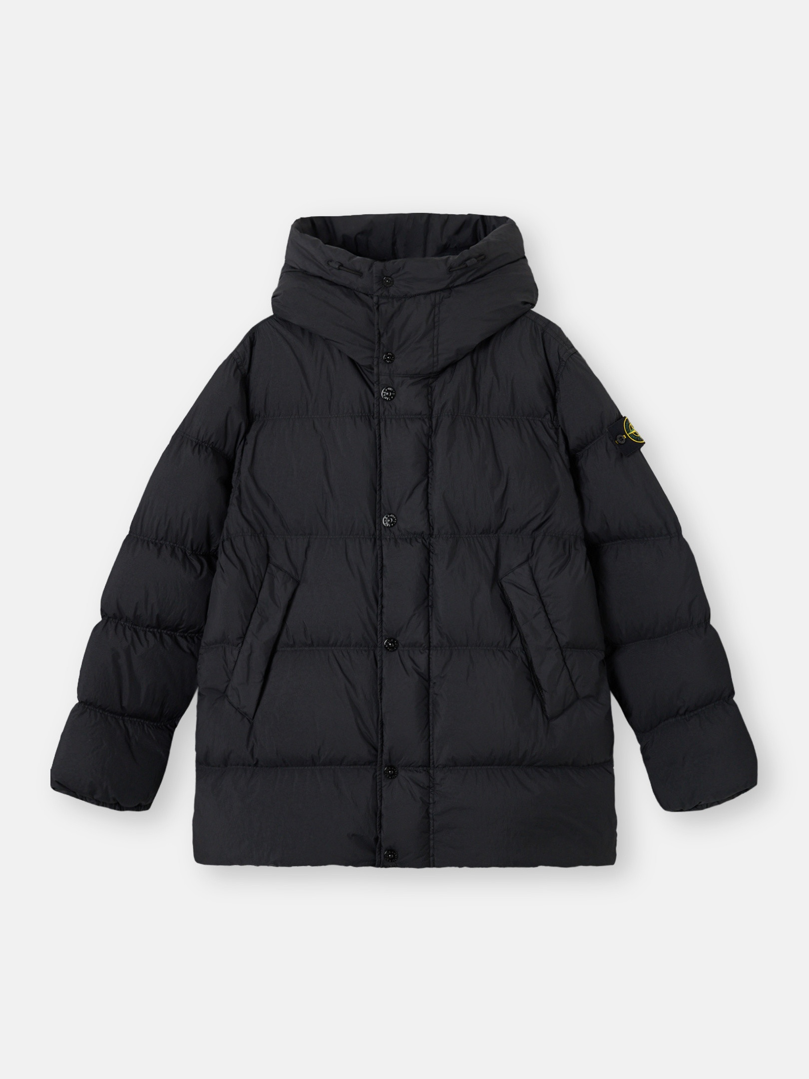 Hooded down parka in recycled nylon rep whose inner resin coating makes the garment wind resistant with a crinkled appearance, featuring multiple pockets, elasticated cuffs, and two-way zipper. FABRIC RESEARCH AND TREATMENT Hooded down parka in a light recycled nylon rep with an ultra-tight weaving construction. The resin coating of its inner face makes it wind resistant and mildly water resistant. Due to the resin treating of the material, the color penetrates unevenly into the material, lending a crinkled appearance to the surface. The piece is padded with the finest feathers specifically treated to withstand the garment dyeing procedure. RDS - Responsible Down Standard certified. STYLE AND FIT Padded hood with fixed drawstring. Slanted hand pockets with zipper under fixed flap. One inner pocket with button and Compass logo embroidery. Stone Island badge on left sleeve. Elasticated cuffs. Drawstring at hem. Two-way zipper fastening under snap placket. COMPOSITION AND CARE Garment: 100% Polyamide / Nylon. Coating: 100% Polyurethanic Resin. Lining: 100% Polyamide / Nylon. Garment Detail Padding: 100% Polyester. Garment Padding: Duck Down (Minimum 80% Down) 80% Duck Down 20% Duck Feather. Contains Non-textile Parts Of Animal Origin