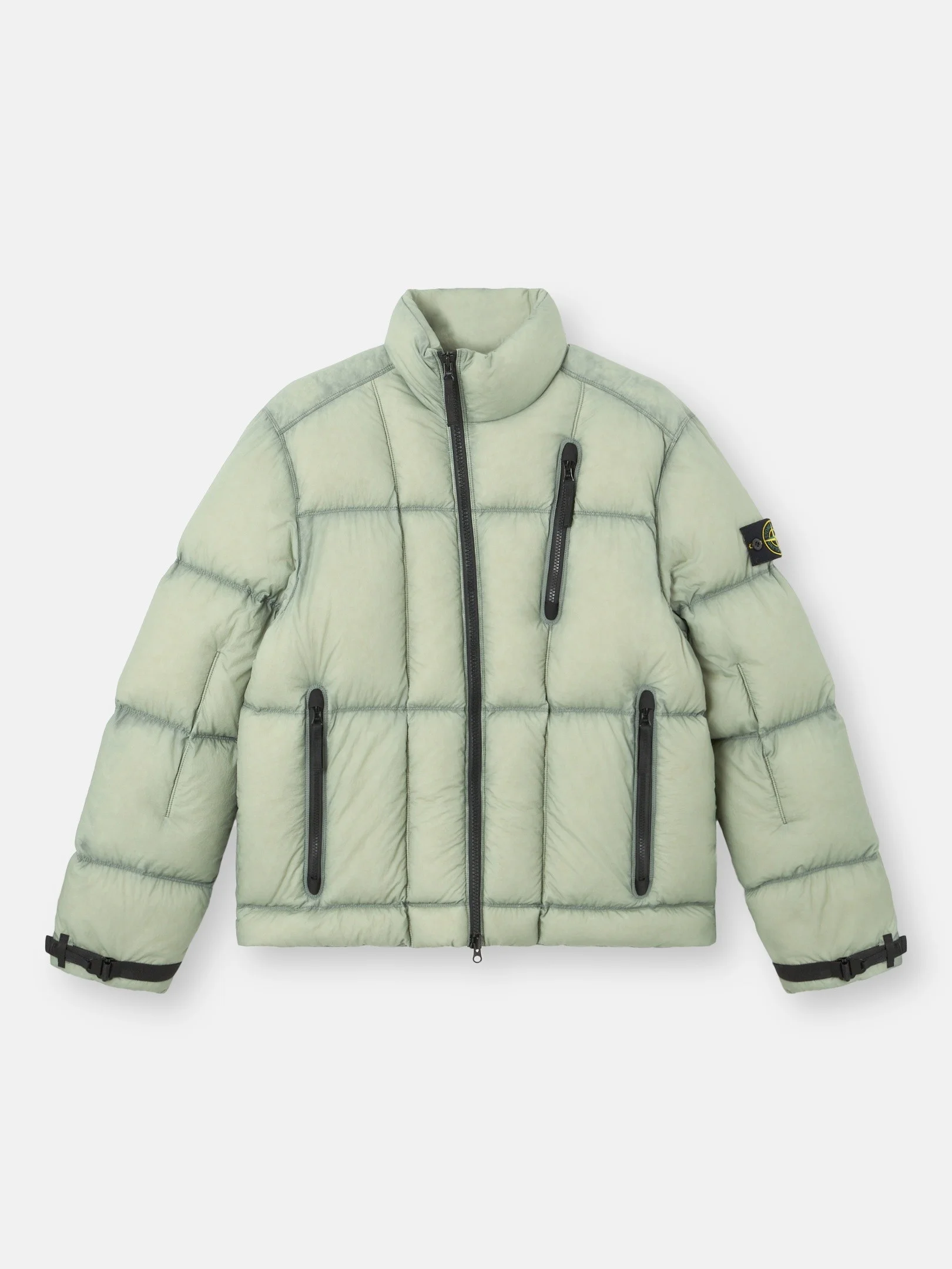 Stand collar down jacket in a lightweight recycled nylon canvas with subtle tonal contrasts along the seams, featuring zipper pockets, adjustable cuffs, and a drawcord hem. FABRIC RESEARCH AND TREATMENT Stand collar down jacket in a lightweight 15 denier recycled nylon canvas. The semi-transparency of the outer fabric creates a chiaroscuro effect achieved through the overlap with the black layer underneath the padding. The color contrast is particularly visible along the garment’s seams and changes as the padding shifts. Padded with the finest feathers. RDS - Responsible Down Standard certified. STYLE AND FIT Padded stand collar. Vertical chest pocket and hand pockets with zipper. Internal top-entry pocket with button and Compass logo embroidery. Plain back yoke. Stone Island badge on left sleeve. Nylon tape adjuster at cuffs. Elasticated drawcord with stoppers at hem. Two-way zipper fastening. COMPOSITION AND CARE External Fabric: 100% Polyamide / Nylon Lining: 100% Polyamide / Nylon Padding : Duck Down ( Minimum 90% Down ) 90% Duck Down 10% Duck Feather Contains Non-textile Parts Of Animal Origin
