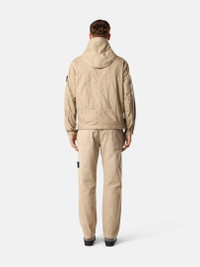 Hooded jacket in an innovative nylon panama fabric designed to mimic natural fibers while offering greater lightness and strength, featuring zipper pockets and elasticated cuffs. Garment dyed. FABRIC RESEARCH AND TREATMENT Hooded jacket made of an innovative Made in Japan 100% nylon fabric with an impressive organic appearance. The super-thin nylon extrusions are cut, mixed, blown, carded, twisted and spun to mimic natural fibers. The resulting panama weaved calendered fabric is lighter and stronger than natural fabrics. The garment dyeing procedure, thanks to the uneven penetration into the calendered fabric, lends a marbled look to the surface. Garment dyed using specific recipes with the addition of a special anti-drop agent. STYLE AND FIT Lined hood with fixed elasticated drawcord. Front yoke. Angled hand pockets with concealed zipper. Stone Island badge on left sleeve. Elasticated cuffs. Drawcord with stoppers at bottom hem. High-neck two-way zipper fastening. COMPOSITION AND CARE External Fabric: 100% Polyamide / Nylon Hood Lining: 100% Polyamide / Nylon