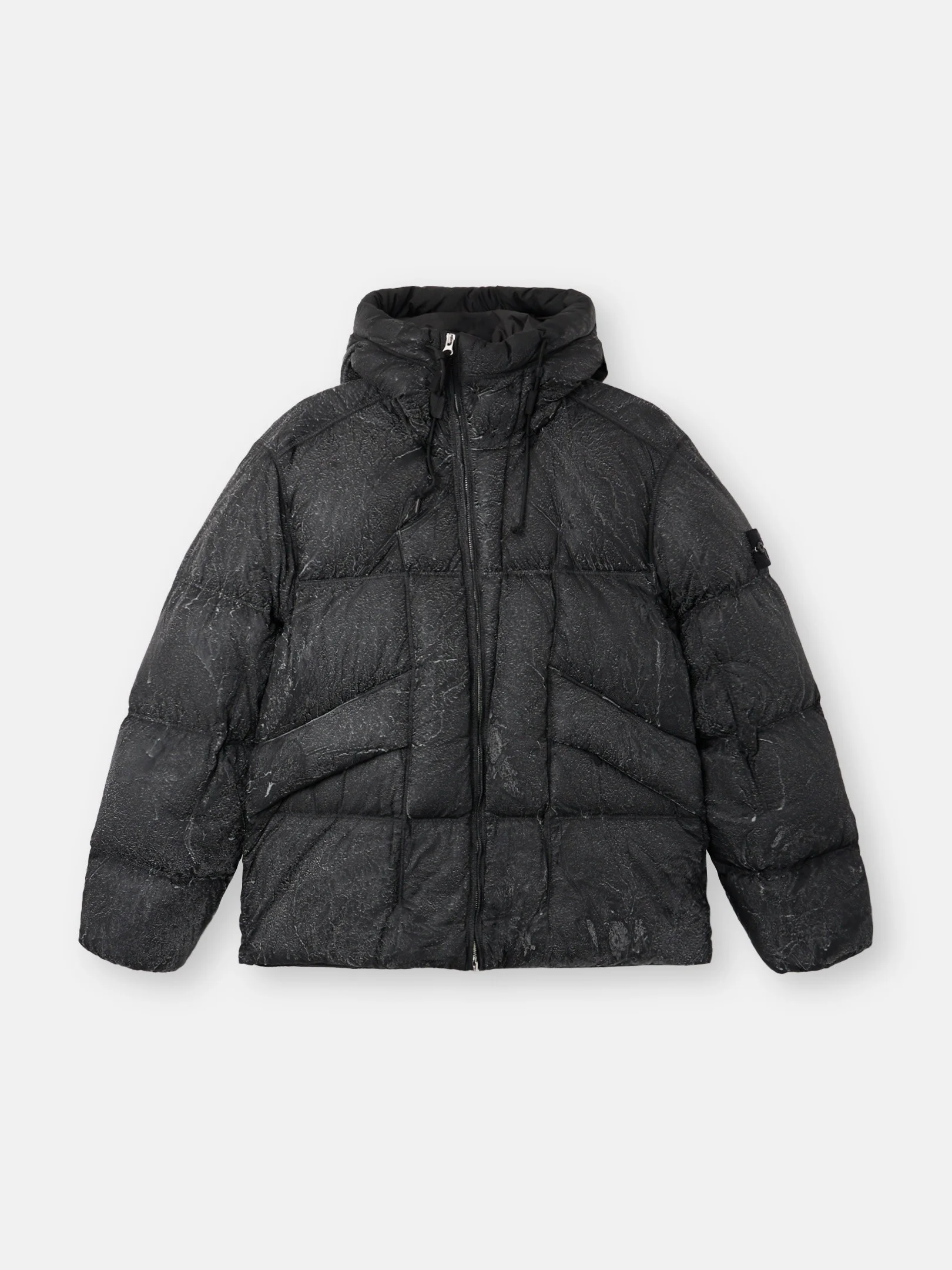 Hooded down jacket in a lightweight recycled nylon canvas, manually sprayed with a reflective solution for a marbled effect, featuring elasticated cuffs and a two-way zipper. Treated with anti-drop. FABRIC RESEARCH AND TREATMENT Hooded down jacket in a lightweight 15 denier recycled nylon canvas. The piece is manually sprayed with a highly reflective solution containing thousands of glass microspheres, creating a marbled effect. The artisanal process renders each garment unique and unrepeatable. The addition of a special agent to the dye formula lends anti-drop properties to the piece. Padded with the finest feathers. RDS - Responsible Down Standard certified. STYLE AND FIT Padded hood featuring elasticated drawstring with stoppers and tunnel loop guides, and snap on back to secure. Angled hand pockets with fixed flap and concealed zipper. Internal top-entry pocket with button and Compass logo embroidery. White Stone Island research badge on left sleeve. Elasticated cuffs. Concealed two-way zipper fastening. COMPOSITION AND CARE External Fabric: 100% Polyamide / Nylon Lining: 100% Polyester Hood Lining: 100% Polyester Padding : Duck Down ( Minimum 90% Down ) 90% Duck Down 10% Duck Feather Contains Non-textile Parts Of Animal Origin