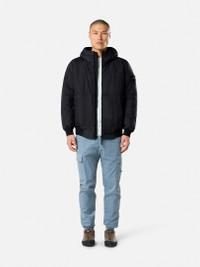Hooded down jacket in a light recycled nylon rep with a crinkled appearance, padded with PrimaLoft®-TC, featuring a Compass logo embroidery and elasticated cuffs. Garment dyed with anti-drop. FABRIC RESEARCH AND TREATMENT Hooded jacket in a light recycled nylon rep with an ultra-tight weaving construction. The resin coating of its inner face makes it wind resistant and mildly water resistant. Due to the resin treating of the material, the color penetrates unevenly into the material, lending a crinkled appearance to the surface. Padded with PrimaLoft®-TC, an exclusive blend of high-performance insulating fibers, 70% recycled, engineered with Stone Island for garment dyeing. Garment dyed with the addition of a special anti-drop agent. STYLE AND FIT Elasticated drawcord with stoppers in hood contour and across crown. Vertical patch hand pockets with concealed zipper. Internal top-entry pocket with button and Compass logo embroidery. Stone Island badge on left sleeve. Elasticated ribbed cuffs and bottom band. Concealed two-way zipper fastening. COMPOSITION AND CARE External Fabric: 100% Polyamide / Nylon Coating: 100% Polyurethanic Resin Ribbing: 95% Polyamide / Nylon 5% Elastane / Spandex Lining: 100% Polyamide / Nylon Hood Lining: 100% Polyamide / Nylon Padding: 100% Polyester