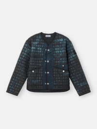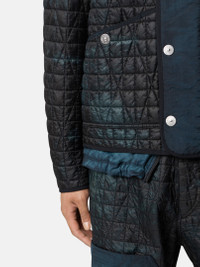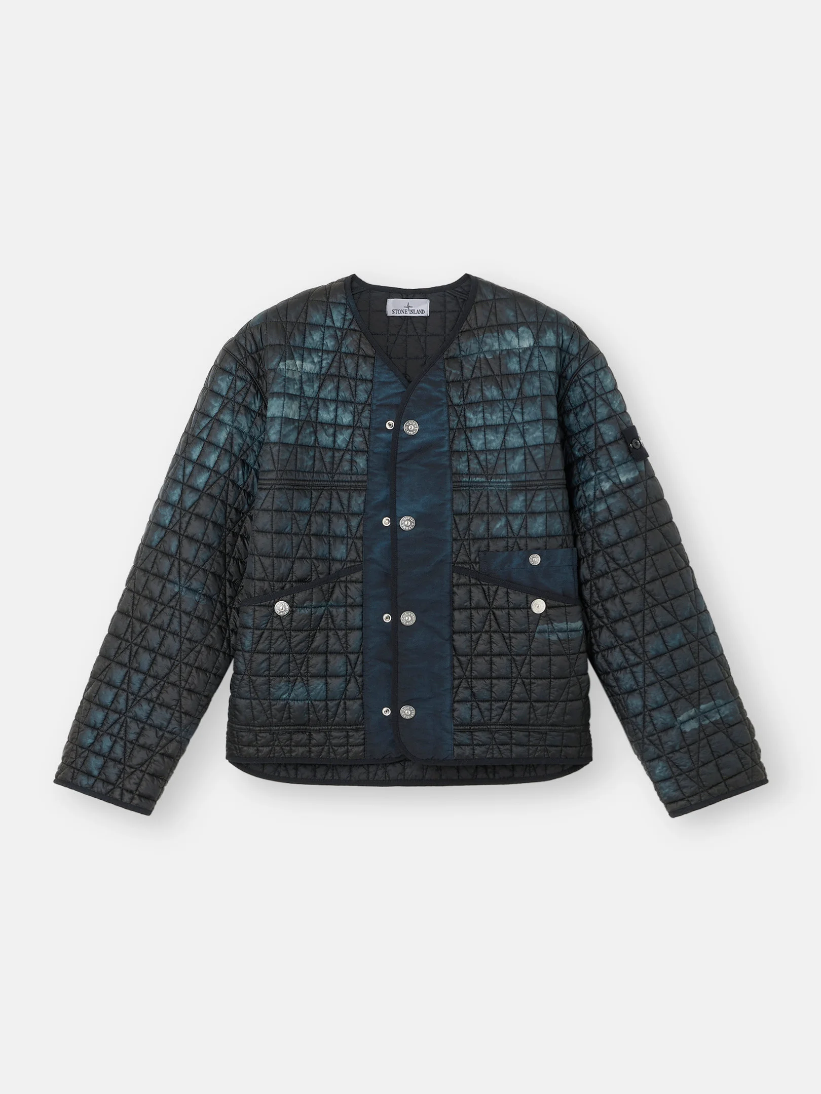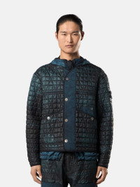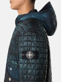 Jacket in a lightweight recycled nylon reps with PrimaLoft® padding and wind-resistant and moderate water-resistant inner resin coating. Garment dyed with corrosion treatment, making each piece unique. FABRIC RESEARCH AND TREATMENT Quilted jacket made from a lightweight, ultra-tightly woven recycled nylon reps, resin-coated on the inside for wind resistance and moderate water resistance and quilted with a multi-axial pattern onto an inner padding layer. Garment dyed with carefully selected dyes, then faded through an innovative corrosion treatment, reflecting Stone Island’s ongoing commitment to research and experimentation. The corroded areas take on a worn appearance and varying colors due to the irregularity of the treatment, creating a blurred effect and making each piece unique. Treated with a specific anti-drop agent. Multiaxial quilting padded with PrimaLoft®. STYLE AND FIT V-neckline. Yoke on front. Slanted hand pockets with top entrance and snap; on left side, second pocket in nylon with snap. Openings at armholes. White Stone Island research badge on left sleeve. Drop-tail hem. Placket in contrasting nylon fabric and double row of snaps to close in two different ways. COMPOSITION AND CARE External Fabric: 100% Polyamide / Nylon. Coating: 100% Polyurethanic Resin. Secondary Fabric: 100% Polyamide / Nylon. Lining: 100% Polyamide / Nylon. Padding: 100% Polyester