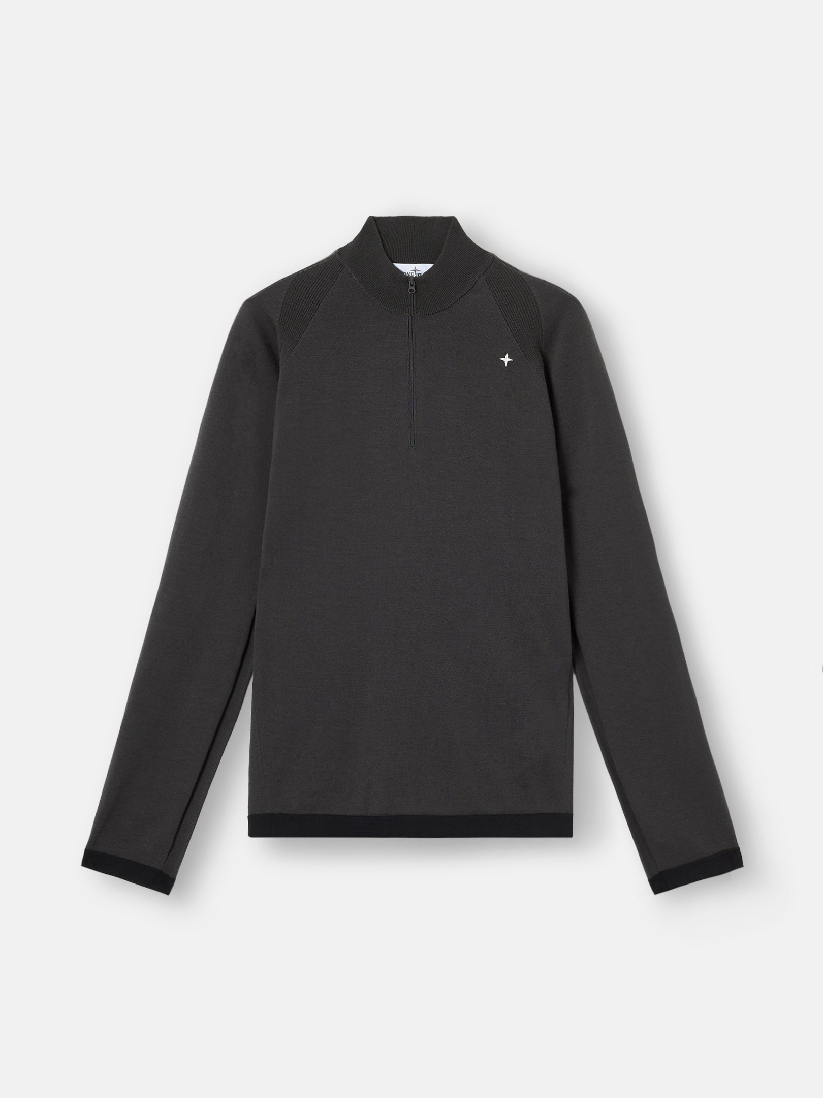 Knit half-zipper sweater with star embroidery, raglan sleeves, perforated inlays, and ribbed elasticated trims. Gauge 14. FABRIC RESEARCH AND TREATMENT Knit half-zipper sweater in PrimaLoft® Bio™ recycled polyester and wool. Stockinette stitch. Gauge 14. STYLE AND FIT Ribbed standing collar with zipper fastening. Stone Island star embroidery on chest. Ribbing along seams of raglan sleeves. Perforated triangular inlay under armholes. Ribbed elasticated trim at cuffs and bottom hem. Regular fit. COMPOSITION AND CARE Garment: 54% Virgin Wool 46% Polyester. Garment Details: 100% Polyamide / Nylon