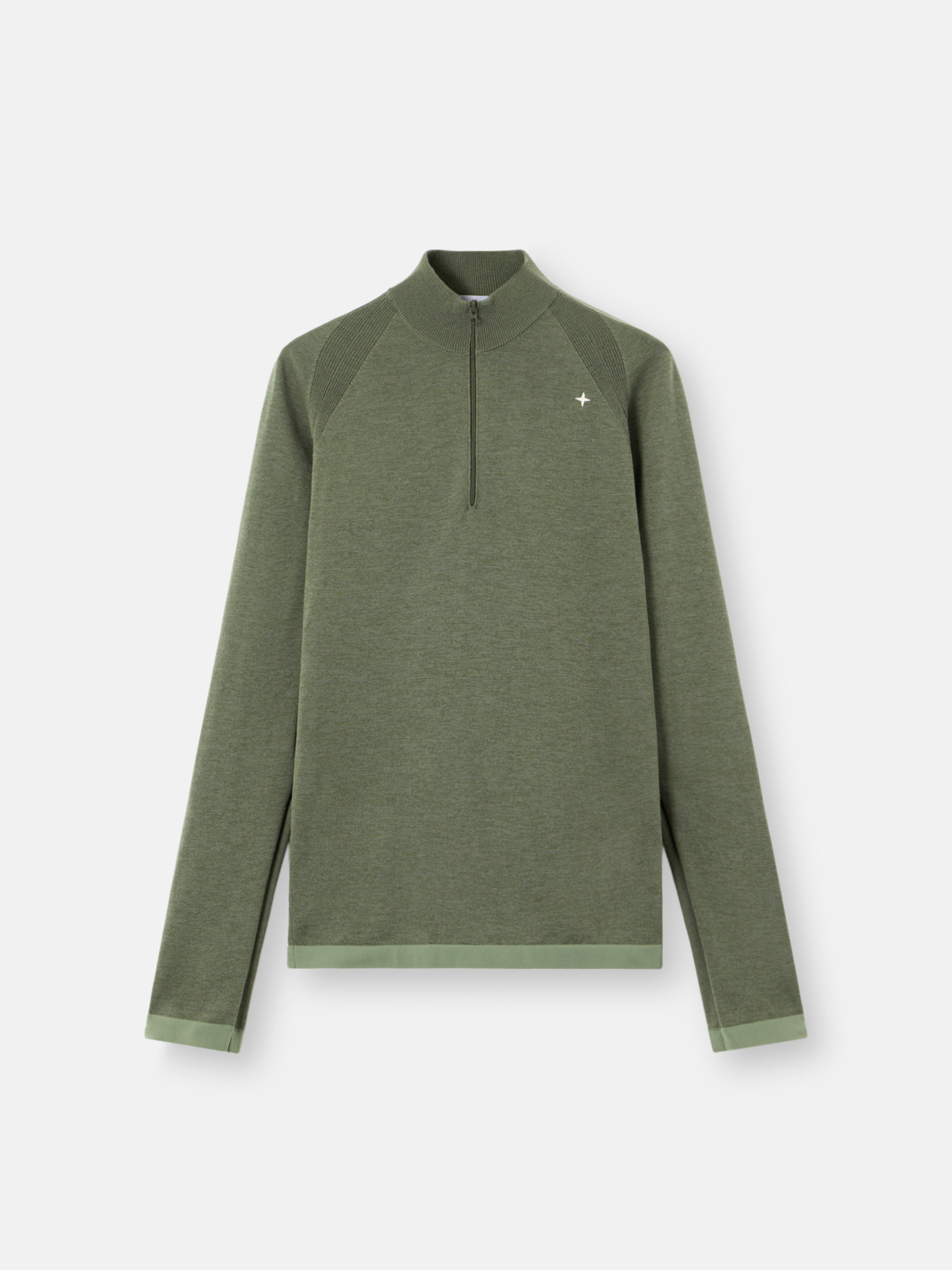 Knit half-zipper sweater with star embroidery, raglan sleeves, perforated inlays, and ribbed elasticated trims. Gauge 14. FABRIC RESEARCH AND TREATMENT Knit half-zipper sweater in PrimaLoft® Bio™ recycled polyester and wool. Stockinette stitch. Gauge 14. STYLE AND FIT Ribbed standing collar with zipper fastening. Stone Island star embroidery on chest. Ribbing along seams of raglan sleeves. Perforated triangular inlay under armholes. Ribbed elasticated trim at cuffs and bottom hem. Regular fit. COMPOSITION AND CARE Garment: 54% Virgin Wool 46% Polyester. Garment Details: 100% Polyamide / Nylon