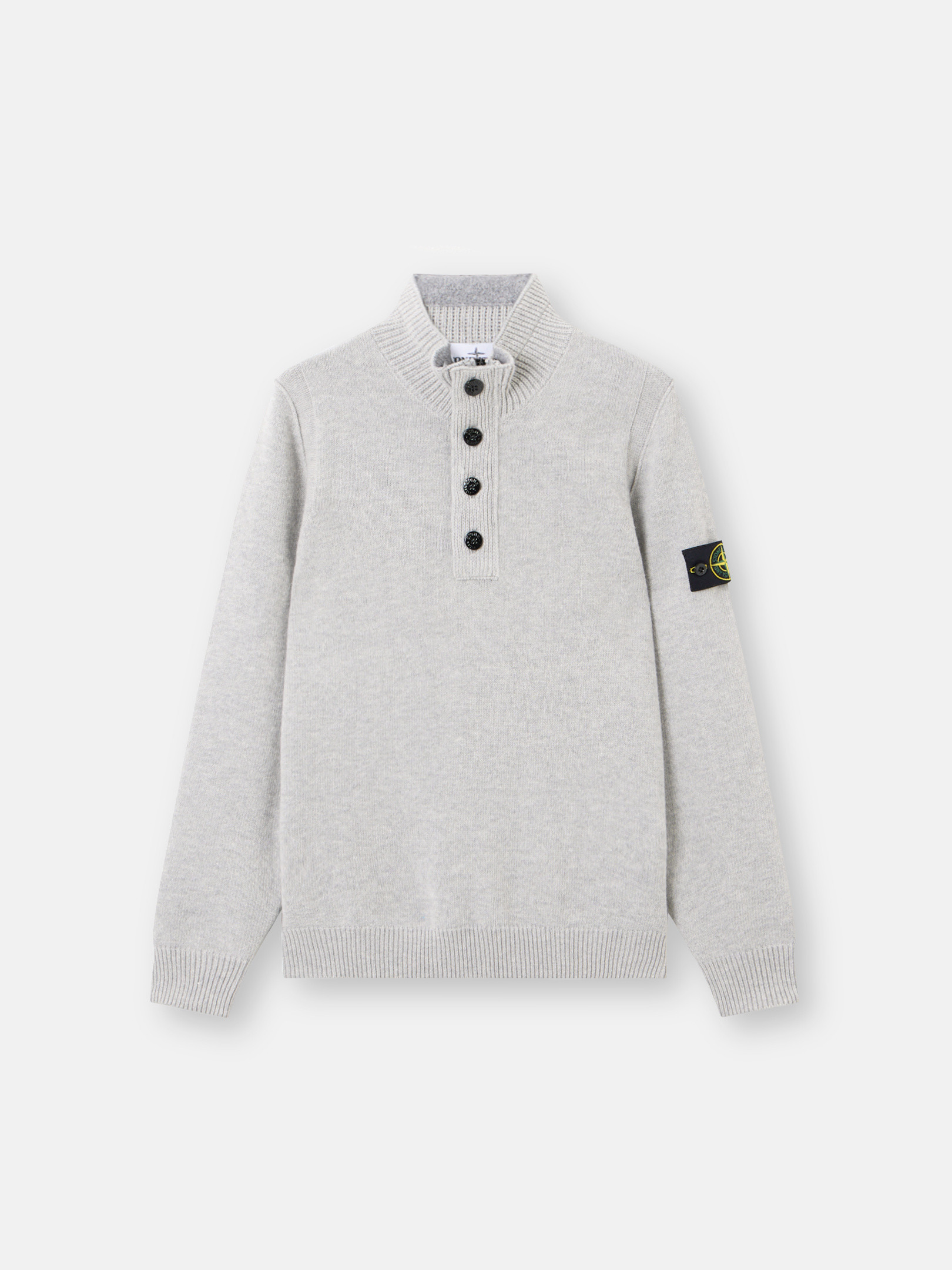 Knit half-zipper sweater in a lamb wool and nylon blend featuring a felt-lined button placket, ribbed collar with inner felt trim, and reverse stitch bands. Gauge 7. FABRIC RESEARCH AND TREATMENT Knit half-zipper sweater in lamb wool and nylon blend. Stockinette stitch. Gauge 7. STYLE AND FIT Ribbed stand collar with inner felt trim and zipper neck fastening under button felt-lined placket. Reverse stitch band at shoulders and along armholes. Stone Island badge on left sleeve. Ribbed cuffs and bottom band. Regular fit. COMPOSITION AND CARE 80% Wool 20% Polyamide / Nylon