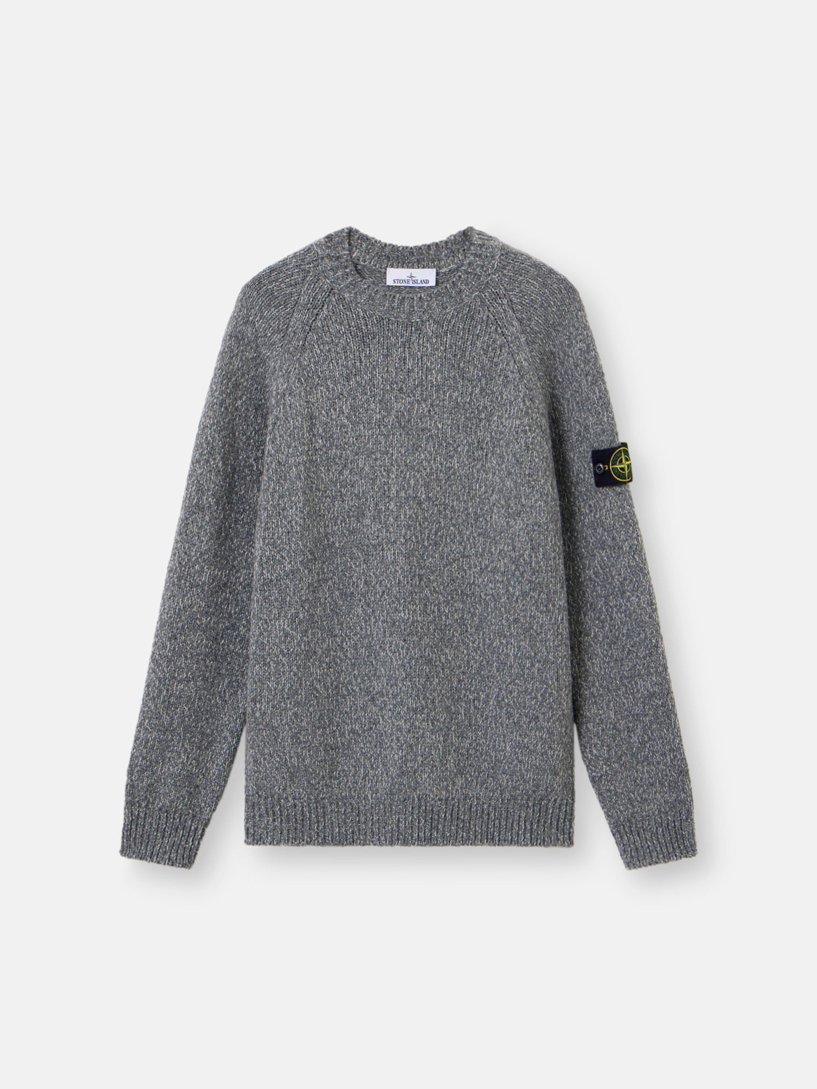 Knit crewneck sweater in mouline wool and nylon featuring raglan sleeves and ribbed trims. Gauge 3. FABRIC RESEARCH AND TREATMENT Knit crewneck sweater in mouline wool and nylon. Stockinette stitch. Gauge 3. STYLE AND FIT Ribbed neckline. Raglan sleeves. Stone Island badge on left sleeve. Ribbed cuffs and bottom band. Loose fit. COMPOSITION AND CARE 48% Virgin Wool 43% Polyamide / Nylon 9% Viscose / Rayon