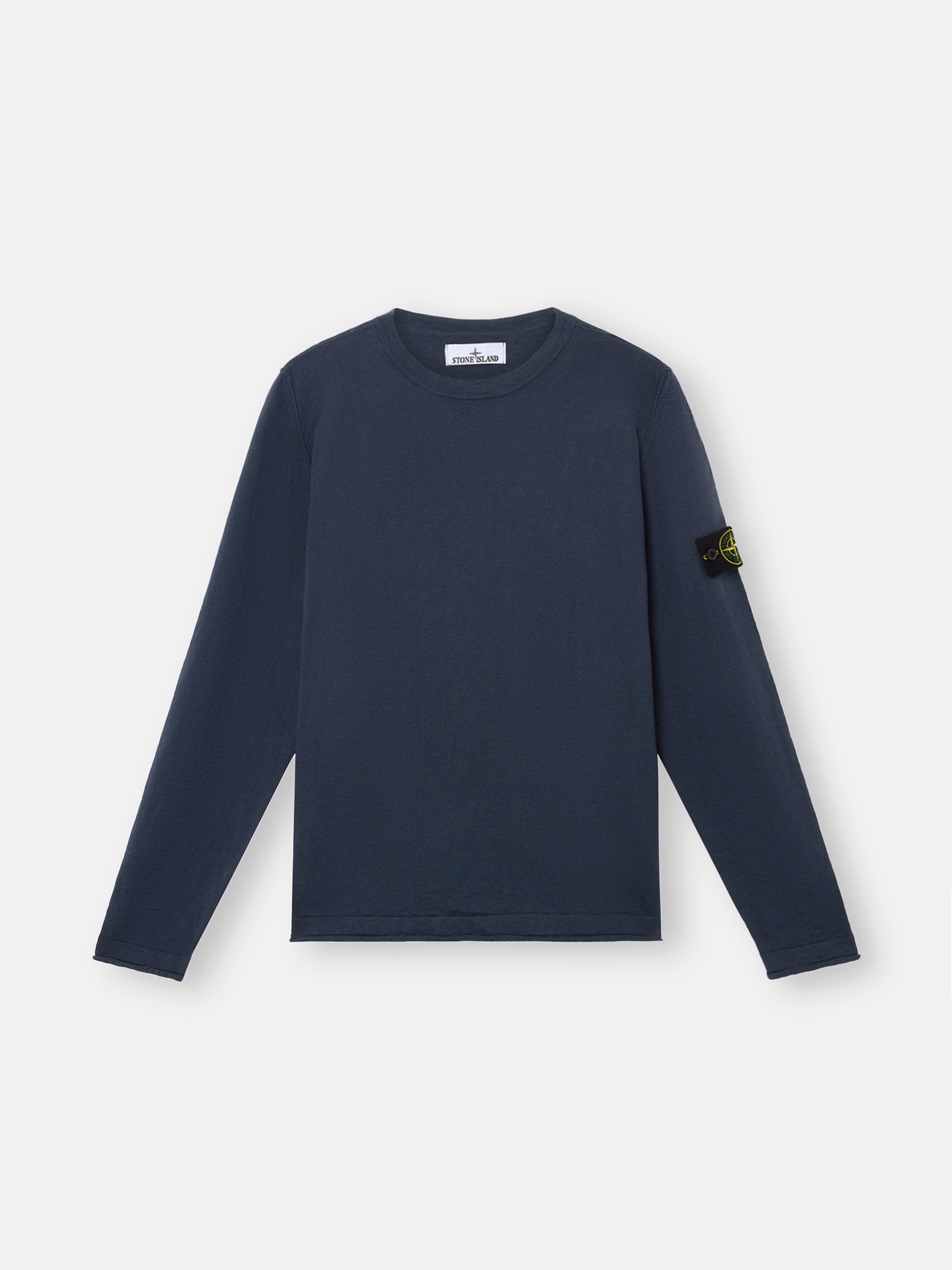 Knit crewneck sweater made from organic cotton and nylon featuring small roll details. Gauge 14. FABRIC RESEARCH AND TREATMENT Knit crewneck sweater in organic cotton and nylon. Stockinette stitch. Gauge 14. STYLE AND FIT Flat neckline. Small roll on armholes. Stone Island badge on the left sleeve. Flat cuffs and bottom band with small roll finish. Regular fit. COMPOSITION AND CARE 78% Cotton 22% Polyamide / Nylon