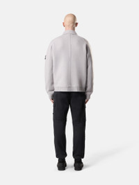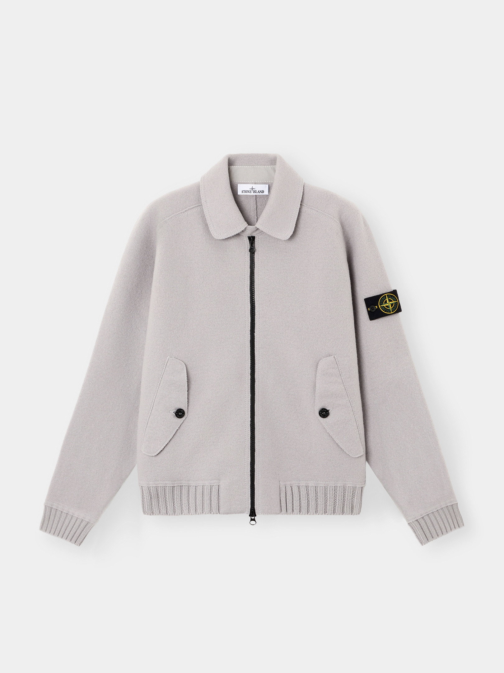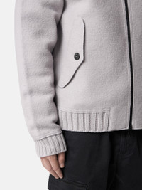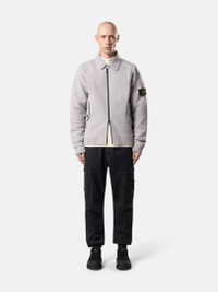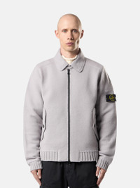 Knit coach jacket in felted RWS wool with chin strap, nylon twill undercollar, pockets with button fastening, ribbed trims, and two-way zipper. Gauge 7. FABRIC RESEARCH AND TREATMENT Coach jacket in felted RWS wool. Gauge 7. STYLE AND FIT Nylon twill undercollar. Chin strap with button. Raglan sleeves. Hand pockets with triangular flap and button. Stone Island badge on left sleeve. Ribbed cuffs and bottom band. Two-way zipper fastening. Oversized fit. COMPOSITION AND CARE Garment: 100% Virgin Wool. Garment Details: 100% Polyamide / Nylon. Inside Garment Details: 100% Polyurethanic Resin
