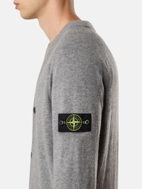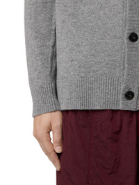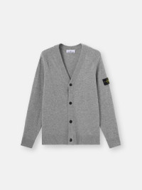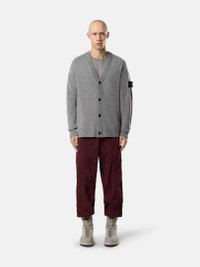 Knit cardigan in light RWS Geelong wool featuring a V-neckline, reverse stitch shoulders, raglan sleeves on the back, and button fastening. Gauge 12. FABRIC RESEARCH AND TREATMENT Knit cardigan in light RWS Geelong wool. Stockinette stitch. Gauge 12. STYLE AND FIT V-neckline. Reverse stitch band at shoulders. Stone Island badge on left sleeve. Ribbed cuffs and bottom band. Raglan sleeves on back. Button fastening. Loose fit. COMPOSITION AND CARE 100% Virgin Wool