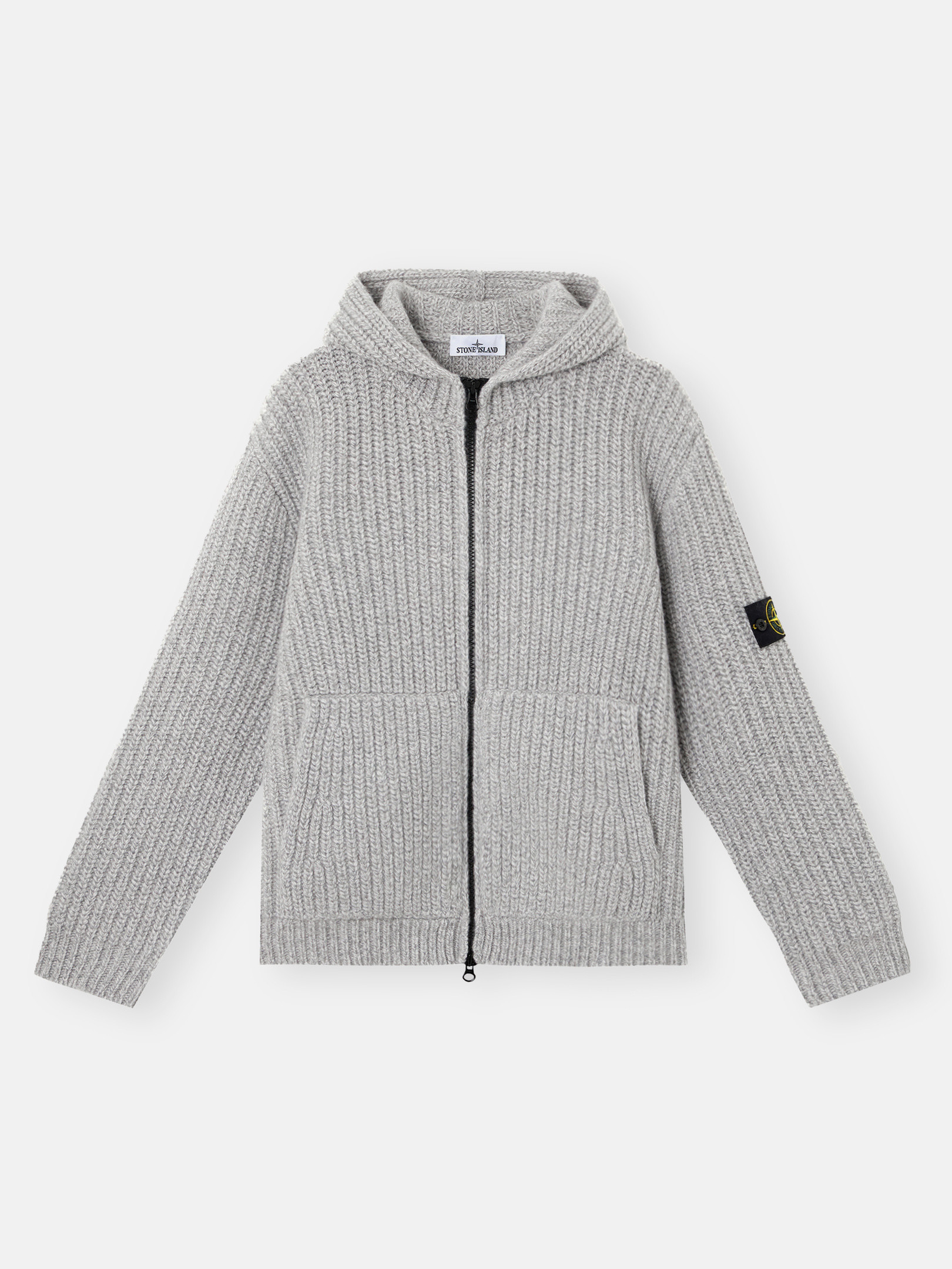 Knit hooded zipper-up sweater in fisherman's rib RWS wool and cashmere, featuring slanted patch pockets, and two-way zipper fastening. Gauge 1.5. FABRIC RESEARCH AND TREATMENT Knit hooded zipper-up sweater in RWS wool and cashmere. Fisherman's rib. Gauge 1.5. STYLE AND FIT Patch hand pockets with slanted entrances. Stone Island badge on left sleeve. Ribbed cuffs and bottom band. Two-way zipper fastening. Oversized fit. COMPOSITION AND CARE 90% Wool 10% Cashmere