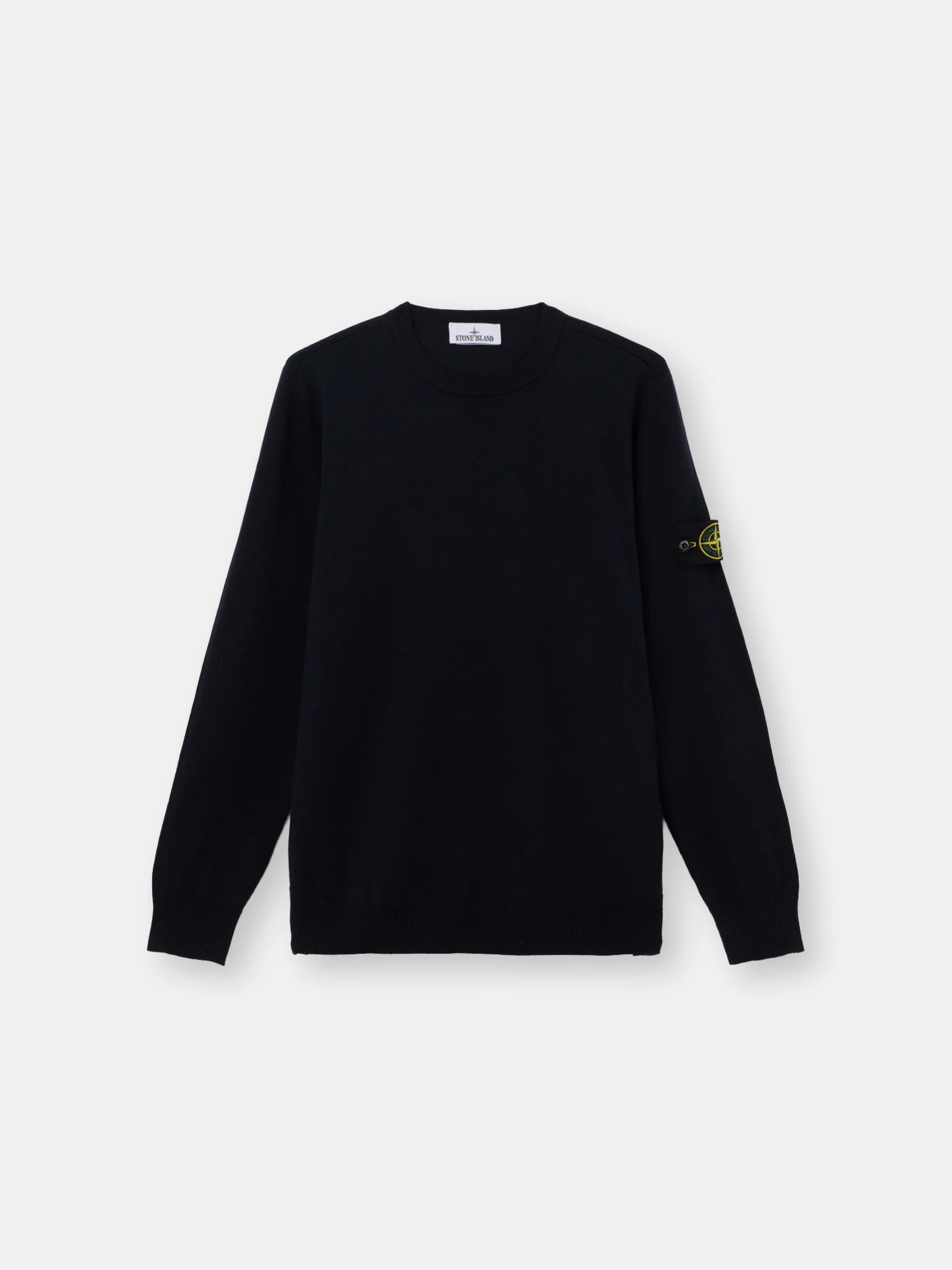 Crewneck sweater in light pure RWS wool, featuring parallel stitched stripes on the back neckline and ribbed trims. Gauge 14. FABRIC RESEARCH AND TREATMENT Knit crewneck sweater in light pure RWS wool. Gauge 14. STYLE AND FIT Ribbed neckline. Parallel stitched stripes on back neckline. Stone Island badge on left sleeve. Ribbed cuffs and bottom band. Regular fit. COMPOSITION AND CARE 100% Virgin Wool