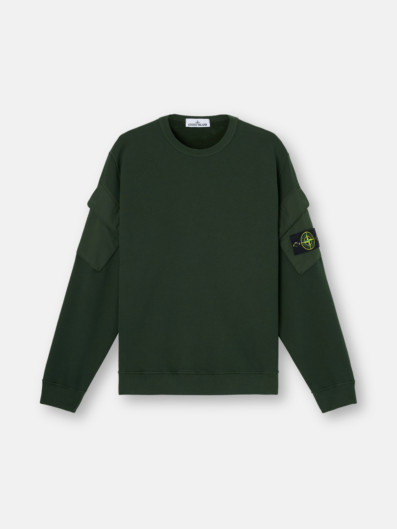 Crewneck sweatshirt in brushed organic cotton fleece, featuring contrast bellows pockets on the sleeves with flap and snaps, with elasticated ribbed trims. Garment dyed. FABRIC RESEARCH AND TREATMENT Crewneck sweatshirt in brushed organic cotton fleece. Garment dyed. STYLE AND FIT Ribbed neckline. On both sleeves, contrast fabric bellows pocket with two snaps under flap; Stone Island badge on left sleeve pocket. Elasticated ribbed cuffs and bottom band. Regular fit. COMPOSITION AND CARE External Fabric: 100% Cotton. Pocket: 100% Cotton. Ribbing: 99% Cotton 1% Elastane / Spandex