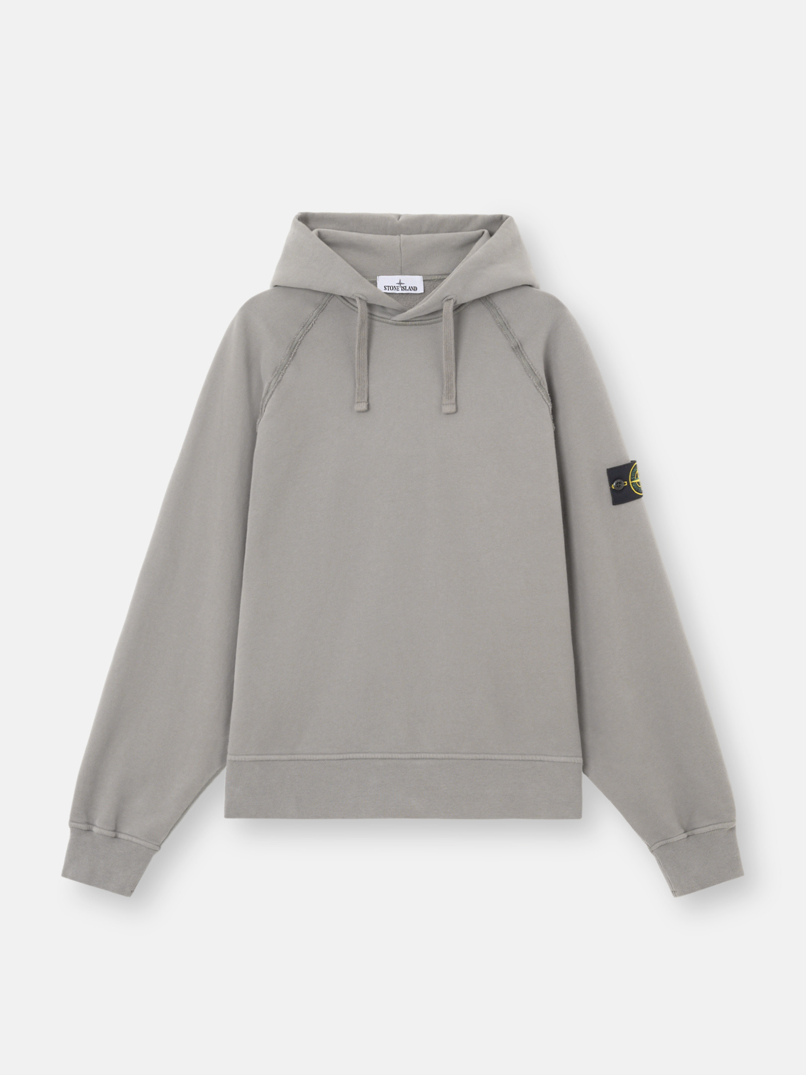 Hooded sweatshirt in brushed organic cotton fleece featuring oversized raglan sleeves with overlock seams and elasticated ribbed cuffs. Garment dyed. FABRIC RESEARCH AND TREATMENT Hooded sweatshirt in brushed organic cotton fleece. Garment dyed. STYLE AND FIT Drawstring hood. Oversized raglan sleeves with overlock seams and frayed edges. Stone Island badge on left sleeve. Elasticated ribbed cuffs and bottom band. Oversized fit. COMPOSITION AND CARE External Fabric: 100% Cotton. Ribbing: 99% Cotton 1% Elastane / Spandex. Hood Lining: 100% Cotton