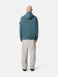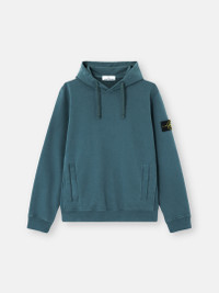 Hooded sweatshirt in brushed organic cotton fleece featuring a pouch pocket with ribbed trim, jersey-lined hood, and ribbed side bands. Garment dyed. FABRIC RESEARCH AND TREATMENT Hooded sweatshirt in brushed organic cotton fleece. Garment dyed. STYLE AND FIT Drawstring hood with cotton jersey lining. Standing-entry pouch pocket with ribbed cotton trim and inner cotton tape reinforcement. Ribbed side bands. Stone Island badge on left sleeve. Elasticated ribbed cuffs and bottom band. Regular fit. COMPOSITION AND CARE External Fabric: 100% Cotton. Secondary Fabric: 99% Cotton 1% Elastane / Spandex. Hood Lining: 100% Cotton