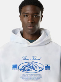 Hooded sweatshirt in organic cotton fleece with an all-over motif created manually using the 'Ice' treatment that changes color based on the temperature. Each piece is one of a kind. FABRIC RESEARCH AND TREATMENT Hooded sweatshirt in organic cotton fleece with an all-over motif created using the ‘Ice’ treatment through the manual application of a thermosensitive pigment that does not alter the underlying fabric. As the temperature drops, the molecules of the pigments, micro-encapsulated in the material, change the color of the pattern. The handmade nature of this technique signifies that each garment is completely one of a kind. STYLE AND FIT On chest, embroidery of cursive Stone Island lettering and mountains and print of text describing treatment. Ribbed cuffs and bottom band. Oversized fit. COMPOSITION AND CARE External Fabric: 100% Cotton. Ribbing: 100% Cotton. Hood Lining: 100% Cotton. Embroidery: 100% Polyester