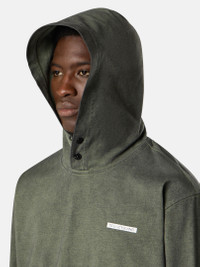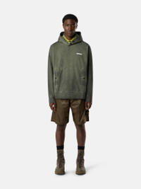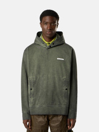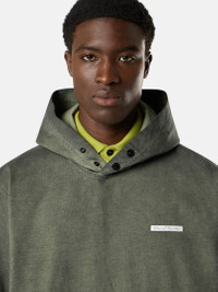 Hooded sweatshirt in compact organic cotton jersey, featuring reverse Stone Island lettering print on the chest and snap pouch pocket. Garment dyed. FABRIC RESEARCH AND TREATMENT Hooded sweatshirt in compact organic cotton jersey with ‘Velo’ effect. Garment dyed. STYLE AND FIT Two snaps at neck. Reverse print of Stone Island lettering on chest. Pouch pocket with standing pockets and snaps. Flat cuffs and bottom band. Comfort fit. COMPOSITION AND CARE Garment: 100% Cotton. Hood Lining: 100% Cotton