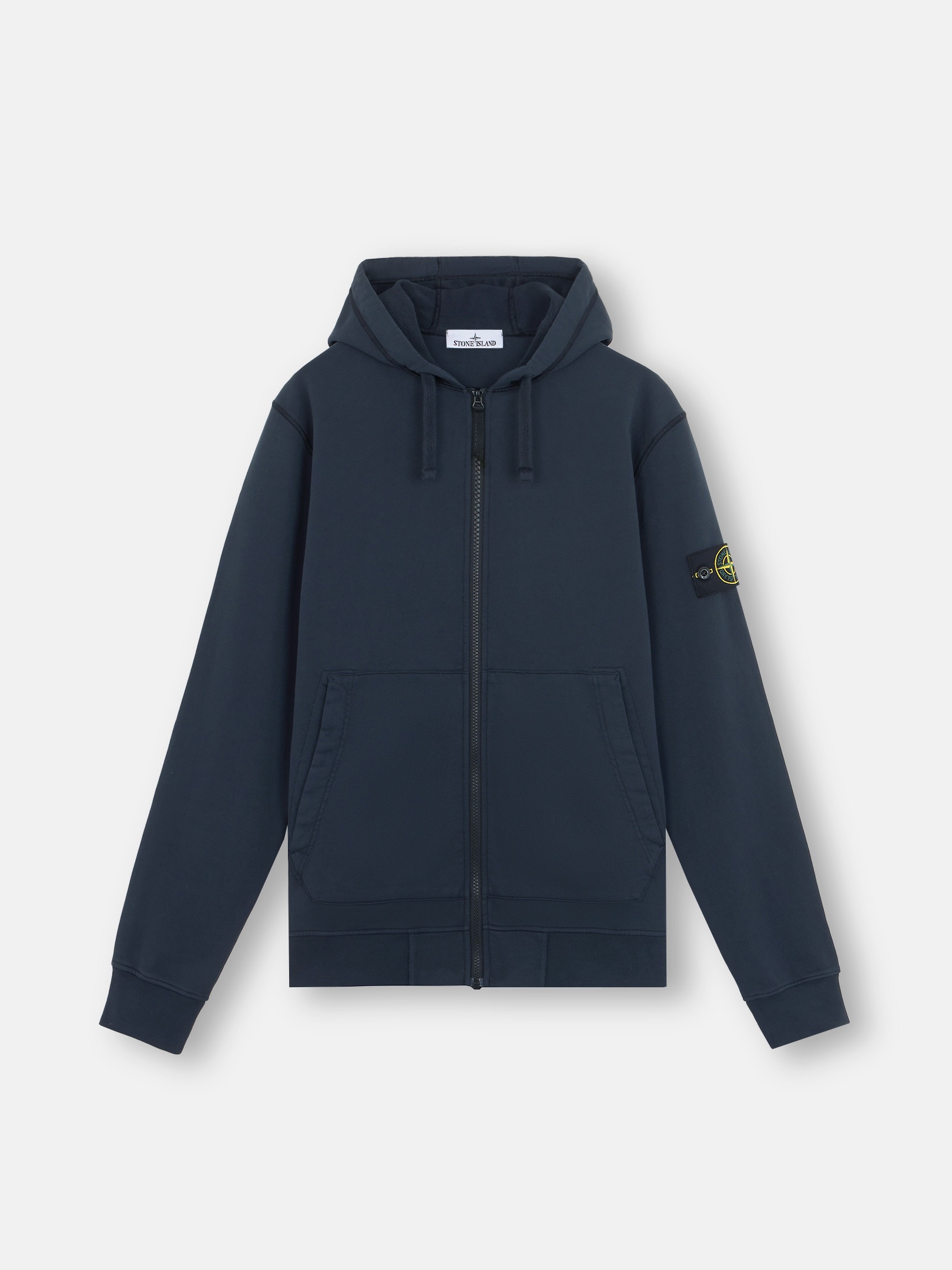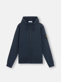 Hooded zipper-up sweatshirt in organic cotton fleece featuring hand pockets with slanted entrance and elasticated ribbed trims. Garment dyed. FABRIC RESEARCH AND TREATMENT Hooded zipper-up sweatshirt in organic cotton fleece. Garment dyed. STYLE AND FIT Drawstring hood. Patch hand pockets with slanted entrance. Stone Island badge on left sleeve. Elasticated ribbed cuffs and bottom band. Zipper fastening. Regular fit. COMPOSITION AND CARE External Fabric: 100% Cotton. Ribbing: 98% Cotton 2% Elastane / Spandex