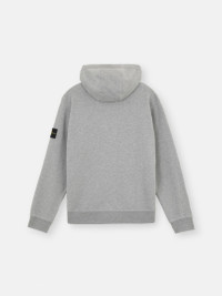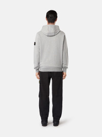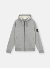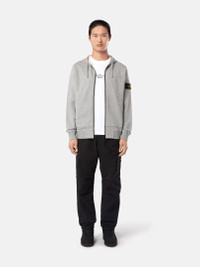 Sweatshirt in organic cotton fleece with a contour drawstring hood, hand pockets, overlock stitches, lunette detail, and zipper fastening. Garment dyed. FABRIC RESEARCH AND TREATMENT Full-zipper hooded sweatshirt in organic cotton fleece. Garment dyed. STYLE AND FIT Hood with contour drawstring. Slanted patch hand pockets. Stone Island badge on the left sleeve. Overlock stitches on hood, shoulders, armholes, and sides. Lunette with inner lining under back neckline. Ribbed cuffs and bottom band. Zipper fastening. Regular fit. COMPOSITION AND CARE External Fabric: 100% Cotton. Ribbing: 98% Cotton 2% Elastane / Spandex