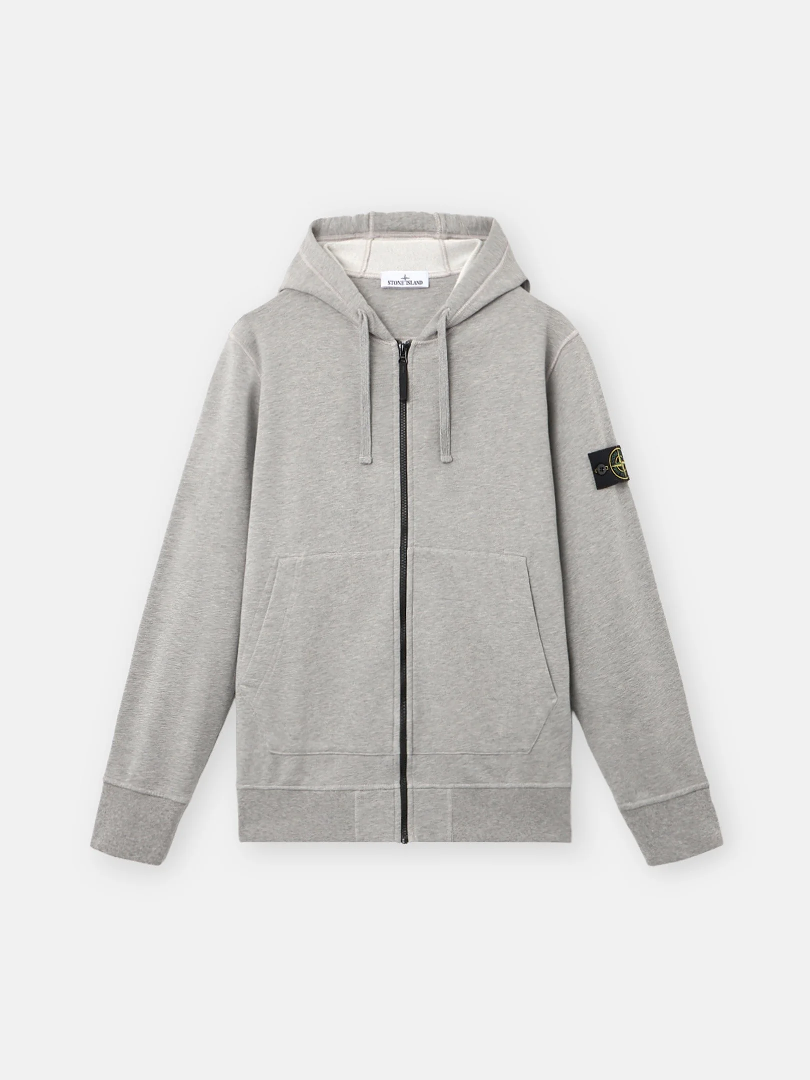 Zipper-up hooded sweatshirt in organic melange cotton fleece, featuring raglan sleeves, hand pockets, overlock seams, and ribbed trims. Midweight. Washed. FABRIC RESEARCH AND TREATMENT Zipper-up hooded sweatshirt in organic melange cotton fleece. Midweight. Washed. STYLE AND FIT Drawstring hood. Angled hand pockets with internal tape reinforcement. Lunette under back neckline with internal reinforcement. Raglan sleeves on back. Stone Island badge on left sleeve. Ribbed cuffs and bottom band. Zipper fastening. Overlock stitching at seams. Regular fit. COMPOSITION AND CARE External Fabric: 100% Cotton. Ribbing: 98% Cotton 2% Elastane / Spandex