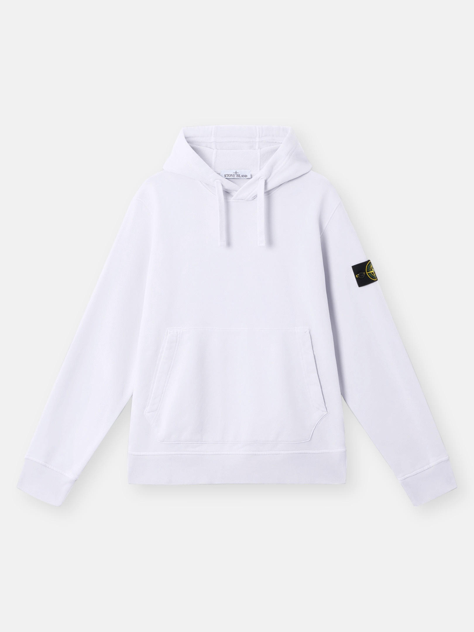 Hooded sweatshirt in organic cotton fleece featuring overlock seams, a pouch pocket with slanted entrances, and elasticated ribbed trims. Garment dyed. FABRIC RESEARCH AND TREATMENT Hooded sweatshirt in organic cotton fleece. Garment dyed. STYLE AND FIT Drawstring hood. Overlock seams. Pouch pocket with slanted entrances. Stone Island badge on left sleeve. Lunette under back neckline with inner lining. Elasticated ribbed cuffs and bottom band. Regular fit. COMPOSITION AND CARE External Fabric: 100% Cotton. Ribbing: 98% Cotton 2% Elastane / Spandex