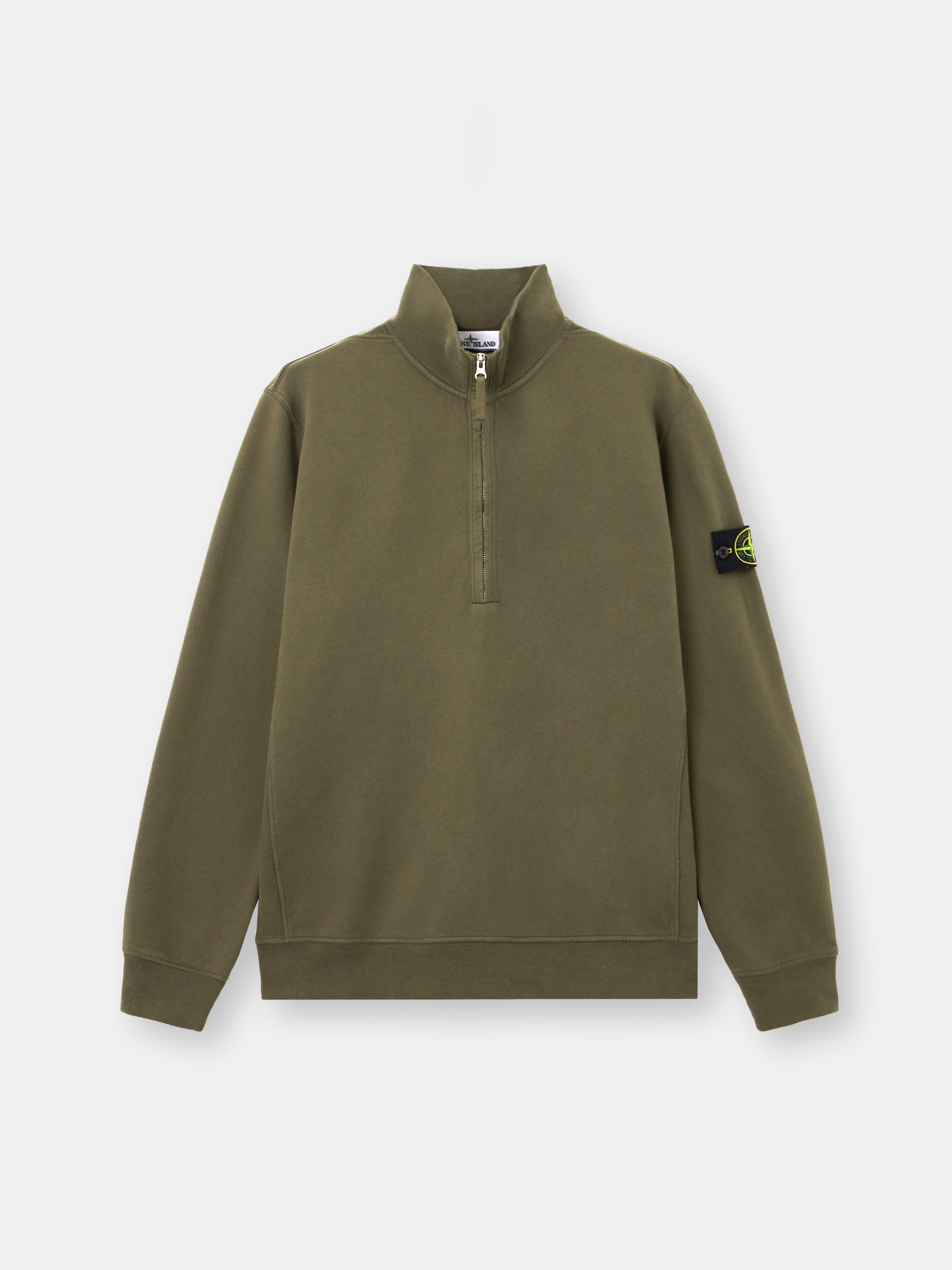 Half-zipper sweatshirt in brushed organic cotton fleece featuring ribbed triangular inlays and side bands, with zipper fastening hidden under cotton trim. Garment dyed. FABRIC RESEARCH AND TREATMENT Half zipper sweatshirt in brushed organic cotton fleece. Garment dyed. STYLE AND FIT Ribbed stand collar with zipper fastening. Ribbed triangular inlay at shoulders and side bands. Stone Island badge on left sleeve. Elasticated ribbed cuffs and bottom band. Zipper fastening hidden under cotton trim. Regular fit. COMPOSITION AND CARE External Fabric: 100% Cotton. Secondary Fabric: 98% Cotton 2% Elastane / Spandex. Garment Details: 100% Cotton