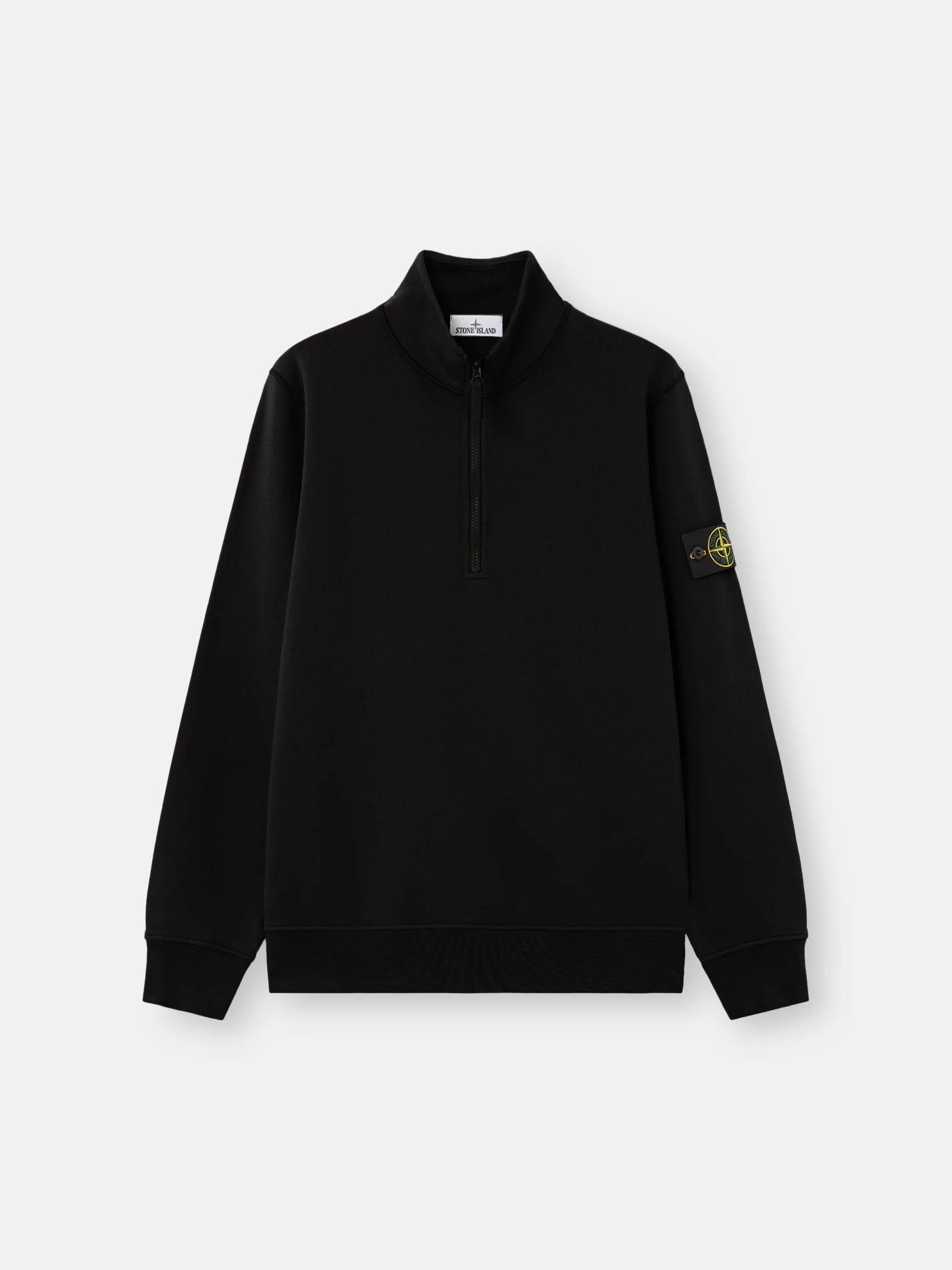 Half-zipper sweatshirt in organic cotton fleece, featuring a stand collar with ribbed lining, overlock seams, and ribbed trims. Midweight. Garment dyed. FABRIC RESEARCH AND TREATMENT Half-zipper sweatshirt in organic cotton fleece. Midweight. Garment dyed. STYLE AND FIT Stand collar with ribbed lining. Half-zipper fastening. Lunette under back neckline with internal reinforcement. Stone Island badge on left sleeve. Ribbed cuffs and bottom band. Overlock stitching at seams. Regular fit. COMPOSITION AND CARE External Fabric: 100% Cotton Ribbing: 99% Cotton 1% Elastane / Spandex