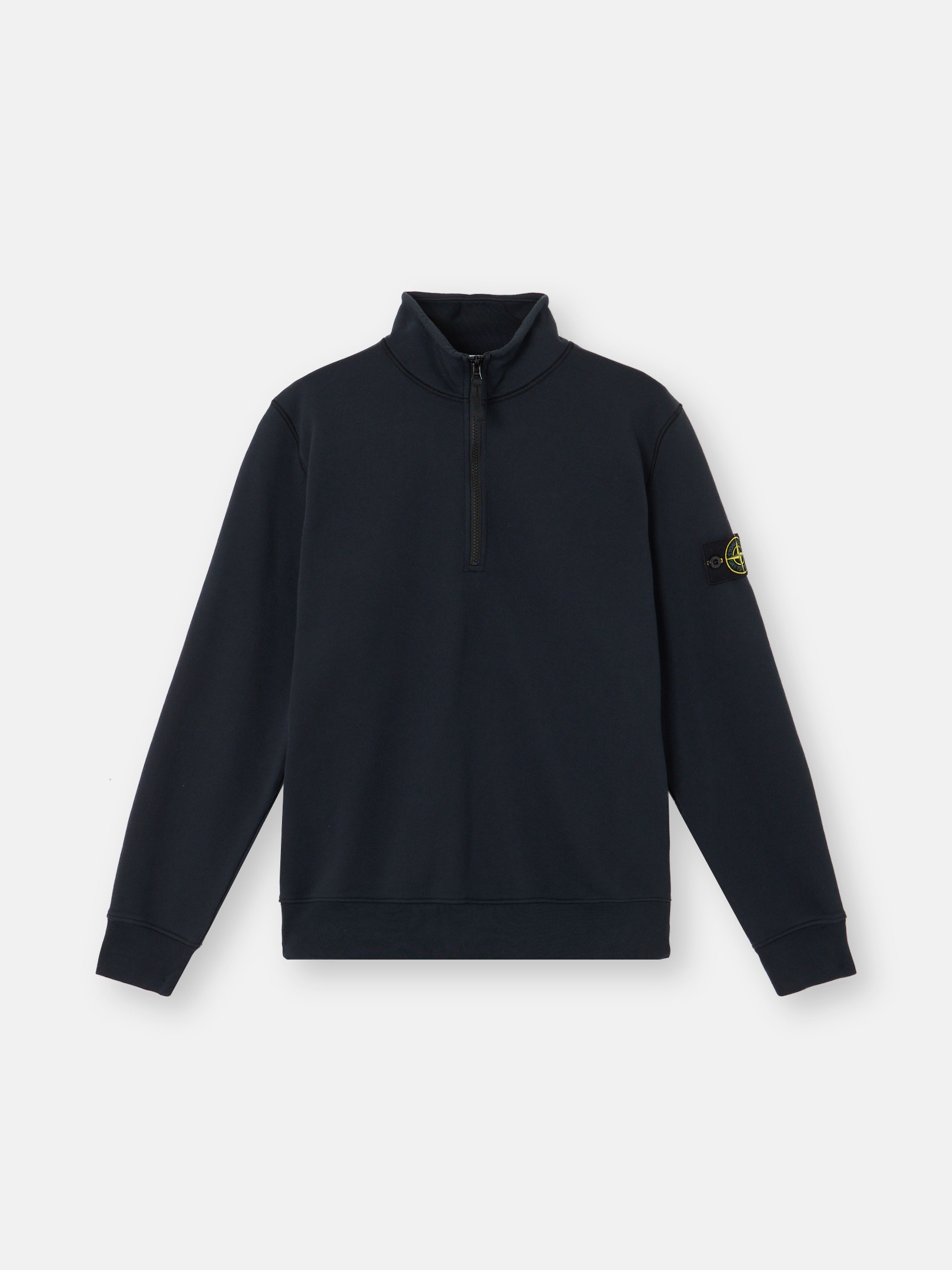 Sweatshirt in organic cotton fleece with zipper-fastened standing collar, featuring finely ribbed lining, patch pockets, and overlock seams. Garment dyed. FABRIC RESEARCH AND TREATMENT Half-zipper sweatshirt in organic cotton fleece. Garment dyed. STYLE AND FIT Standing collar with finely ribbed lining and zipper fastening. Slanted patch pockets. Stone Island badge on the left sleeve. Overlock seams. Ribbed cuffs and bottom band. Regular fit. COMPOSITION AND CARE External Fabric: 100% Cotton. Ribbing: 97% Cotton 3% Elastane / Spandex