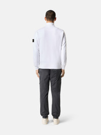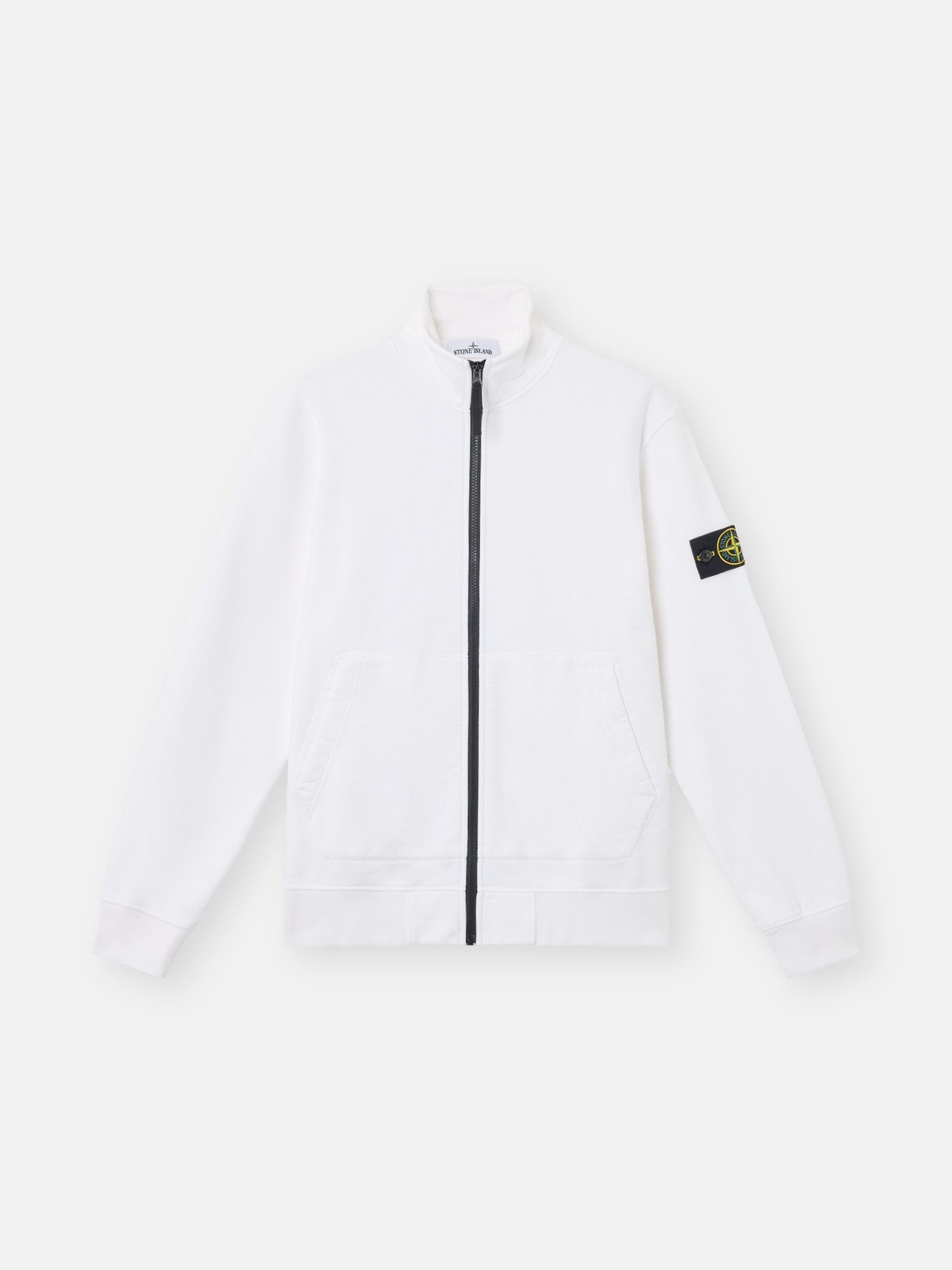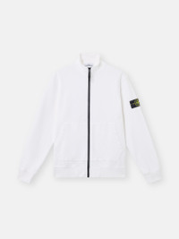 Sweatshirt in organic cotton fleece with standing collar, overstitch seams, patch pockets, a lunette detail under the back neckline, and zipper fastening. Garment dyed. FABRIC RESEARCH AND TREATMENT Full-zipper sweatshirt in organic cotton fleece. Garment dyed. STYLE AND FIT Standing collar. Overstitch seams. Patch pockets with slanted entrance. Stone Island badge on the left sleeve. Ribbed cuffs and bottom band. Lunette with inner lining under back neckline. Zipper fastening. Regular fit. COMPOSITION AND CARE 100% Cotton
