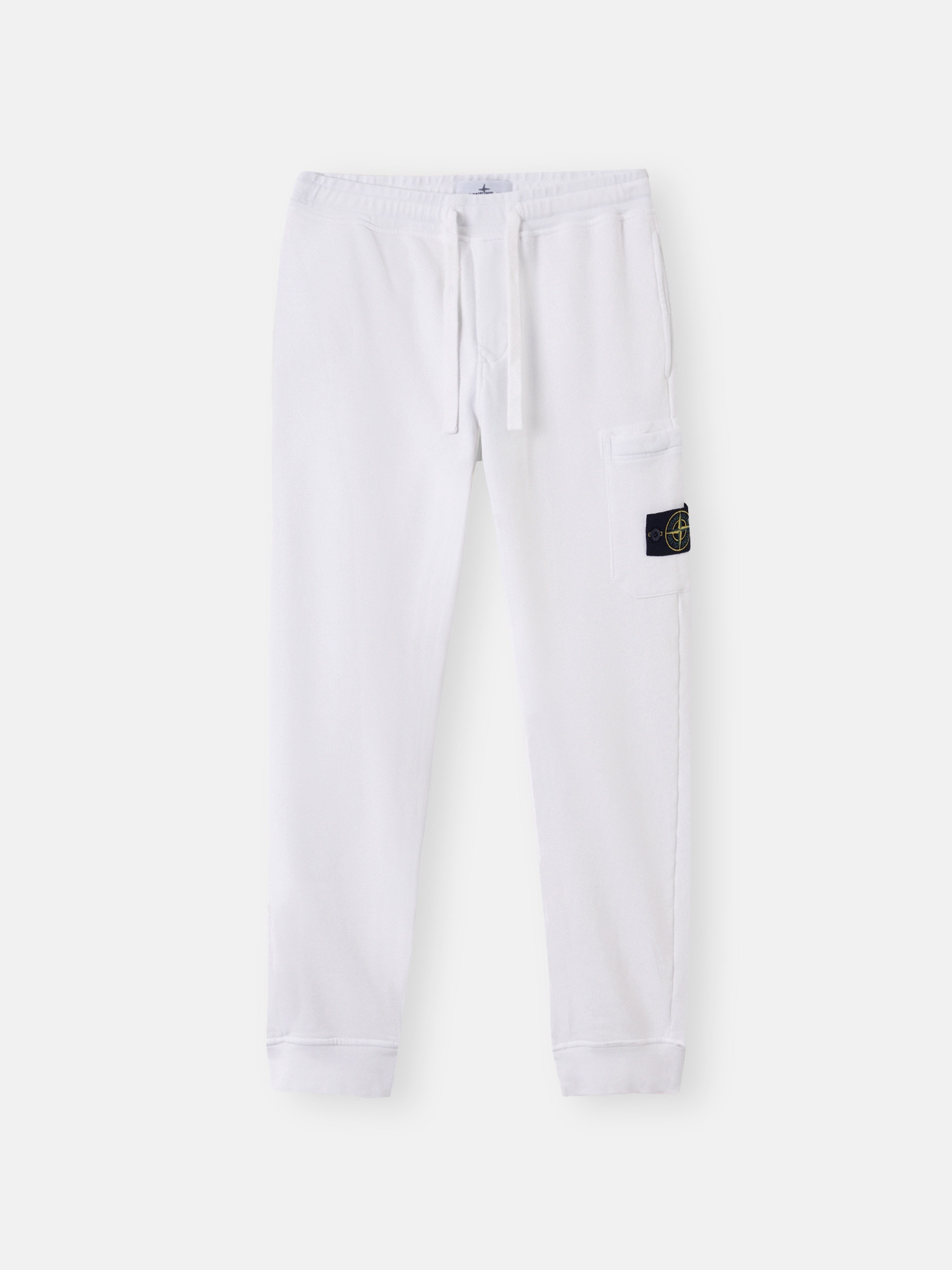 Sweatpants in organic cotton fleece, featuring a zipper pocket on the leg, elasticated cuffs, and an elasticated drawstring waistband with zipper fly. Garment dyed. FABRIC RESEARCH AND TREATMENT Sweatpants in organic cotton fleece. Garment dyed. STYLE AND FIT Standing hand pockets. One back pocket with snap under fixed band. Patch pocket on left leg with hidden zipper and Stone Island badge. Overlock inner leg seams. Elasticated ribbed cuffs. Elastic drawstring waist. Zipper fly. Slim fit. COMPOSITION AND CARE External Fabric: 100% Cotton. Ribbing: 98% Cotton 2% Elastane / Spandex