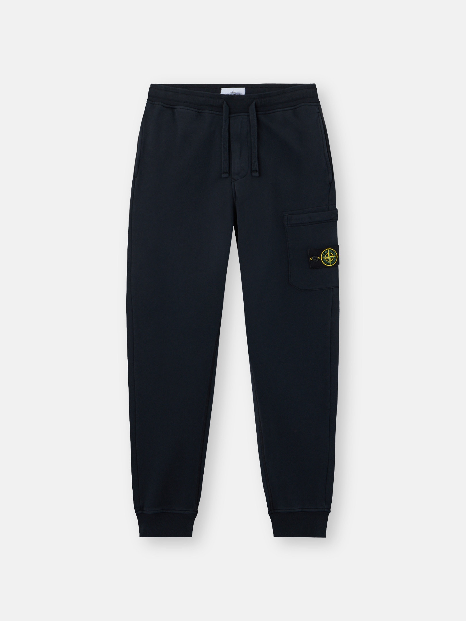 Sweatpants in organic cotton fleece, featuring a zipper pocket on the leg, elasticated cuffs, and an elasticated drawstring waistband with zipper fly. Garment dyed. FABRIC RESEARCH AND TREATMENT Sweatpants in organic cotton fleece. Garment dyed. STYLE AND FIT Standing hand pockets. One back pocket with snap under fixed band. Patch pocket on left leg with hidden zipper and Stone Island badge. Overlock inner leg seams. Elasticated ribbed cuffs. Elastic drawstring waist. Zipper fly. Slim fit. COMPOSITION AND CARE External Fabric: 100% Cotton. Ribbing: 98% Cotton 2% Elastane / Spandex