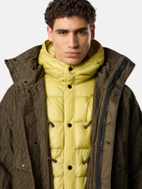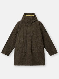 Hooded parka in cotton-nylon corduroy 500 with a springy hand and wrinkled appearance, featuring large bellows pockets and detachable down lining. Garment dyed with anti-drop agent. FABRIC RESEARCH AND TREATMENT Hooded parka made of a cotton-nylon corduroy 500. The weave is made with a monofilament nylon that lends a springy hand and a wrinkled appearance to the fabric. Garment dyed with the addition of a special anti-drop agent. Detachable lining padded with the finest feathers specifically treated to withstand the garment dyeing procedure. RDS - Responsible Down Standard certified. STYLE AND FIT Hood with external fixed drawstring and snaps on back to fasten down slightly. Large bellows hand pockets with fixed diagonal flap and snap over standing pockets with concealed zipper. One internal chest pocket with top entrance and snap that is visible on the outside. Stone Island badge on left sleeve. Tightening snap at cuffs. Two-way zipper fastening under concealed snap placket. Detachable down lining features hood, internal pocket, and snaps and can be attached to outer garment using a system of ties adapted from those used in the sailing world. COMPOSITION AND CARE External Fabric: 76% Cotton 24% Polyamide / Nylon. Secondary Fabric: 100% Polyamide / Nylon. Coating: 100% Polyurethanic Resin. Detachable Internal Garment: 100% Polyamide / Nylon. Coating: 100% Polyurethanic Resin. Lining: 100% Polyamide / Nylon. Hood Lining: 100% Polyamide / Nylon. Padding: Duck Down (Minimum 80% Down) 80% Duck Down 20% Duck Feather. Contains Non-textile Parts Of Animal Origin