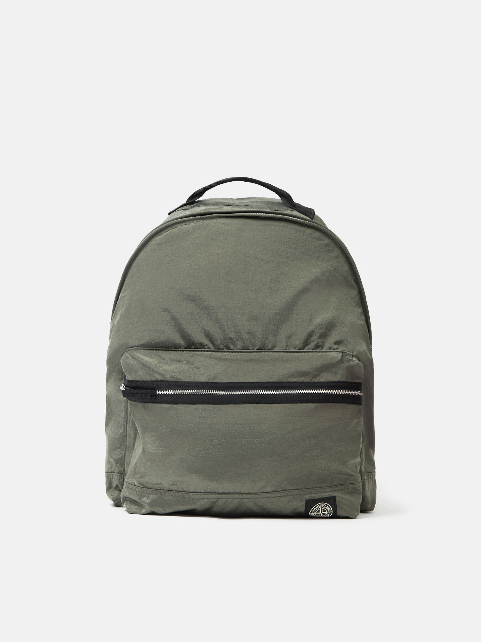 Backpack in Nylon Metal made from ECONYL® regenerated yarns with polyurethane coating, featuring a front zipper pocket, internal compartment, and a Compass logo patch. FABRIC RESEARCH AND TREATMENT Backpack in Stone Island's iridescent Nylon Metal fabric with polyurethane coating. The evolution of this iconic fabric sees the use of ECONYL® regenerated yarns: the life-ended nylon, pre- and post-consumer, is recycled with a complex depolymerization process to create this fiber that features the same intrinsic characteristics of nylon from fossil raw material. STYLE AND FIT Front bellows pocket with horizontal zipper and Stone Island Compass logo patch. Nylon ripstop lining. Internal compartment. Zipper fastening. Adjustable nylon tape shoulder straps. Top handle. COMPOSITION AND CARE External Fabric: 100% Polyamide / Nylon. Coating: 100% Polyurethanic Resin. Lining: 100% Polyamide / Nylon