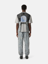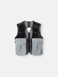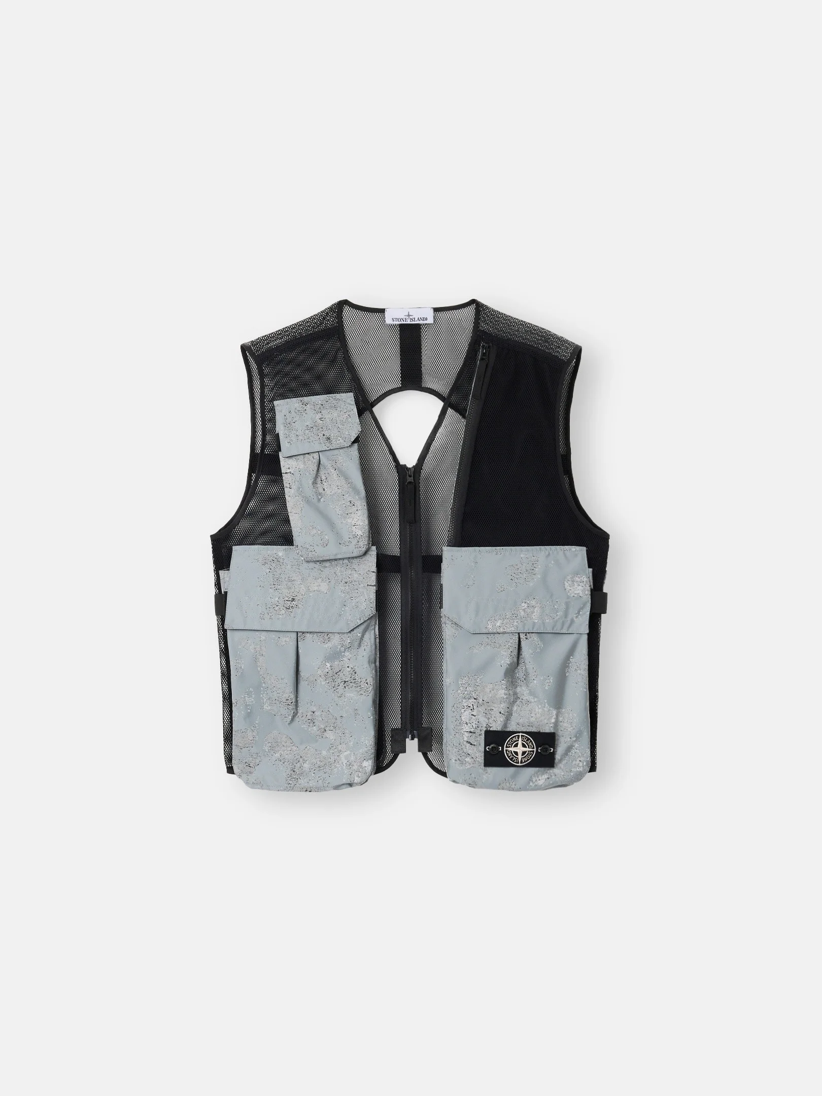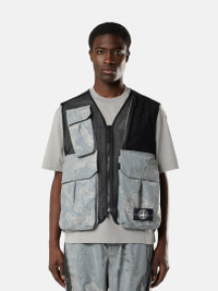Vest in mesh and nylon canvas with a highly reflective coating and camouflage print. Stone Island for Dave: The Boy Who Played the Harp 2026 Tour Collection. FABRIC RESEARCH AND TREATMENT Vest made from mesh and nylon canvas plated with a highly reflective coating, achieved through a resin bath that incorporates thousands of glass microspheres. In this version, the reflective surface is printed with a textured camouflage pattern using the “direct to film” technique: a digital print on an adhesive film is heat-transferred onto the fabric, followed by the application of an additional reflective film. The interaction between the fabric, the print, and the reflective film creates a unique depth of color and shading. Stone Island for Dave: The Boy Who Played the Harp 2026 Tour Collection. STYLE AND FIT Bellows chest, back, and hand pockets with concealed hook-and-loop fastening and elasticated gusset inserts. Gusseted zipper pocket on front left. White Stone Island research badge on bottom left pocket. Tape connector and utility attachment loops on open back. Zipper fastening. COMPOSITION AND CARE