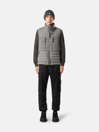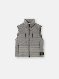 Down vest in a single layer of light stretch nylon with seamless tunnels for improved feather hold, featuring invisible zipper pockets and a padded collar. Garment dyed with anti-drop. FABRIC RESEARCH AND TREATMENT Down vest in a light stretch nylon single layer fabric undergoing a special weaving technique automatically creating the feather compartments directly from the loom. The seamless feather tunnels substantially increase the hold of the down. The finished garment is padded with direct injection with the finest feathers, specifically treated to resist garment dyeing. Garment dyed with the addition of a special anti-drop agent. RDS - Responsible Down Standard certified. STYLE AND FIT Padded stand collar. Standing chest pockets with invisible zipper. Standing hand pockets with invisible zipper. Stone Island badge on left bottom side. Elasticated tape trim at armholes. Drawcord at hem. Two-way zipper fastening with one snap on inner placket. COMPOSITION AND CARE Outside: 86% Polyamide / Nylon 14% Elastane / Spandex. Inside: 86% Polyamide / Nylon 14% Elastane / Spandex. Padding: Duck Down (Minimum 90% Down) 90% Duck Down 10% Duck Feather. Contains Non-textile Parts Of Animal Origin