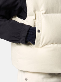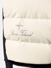 Down vest in cotton moleskin with a double-faced satin weave, resin-treated for wind and mild water resistance, featuring an archival Stone Island logo on the back. Garment dyed with anti-drop. FABRIC RESEARCH AND TREATMENT Down vest made from a cotton moleskin. The fabric's double-faced satin weave is brushed and sheared externally to achieve a warm and velvet-like hand. The fabric is resin-treated with a special anti-drop agent, making it wind resistant and mildly water resistant. RDS - Responsible Down Standard certified. STYLE AND FIT Standing collar. Angled hand pockets with snap. Internal pocket with snap. Embroidered archival Stone Island logo on back. Drawstring at hem. Zipper fastening. COMPOSITION AND CARE External Fabric: 97% Cotton 3% Elastane / Spandex. Lining: 100% Polyamide / Nylon. Padding: Duck Down (Minimum 80% Down) 80% Duck Down 20% Duck Feather. Contains Non-textile Parts Of Animal Origin
