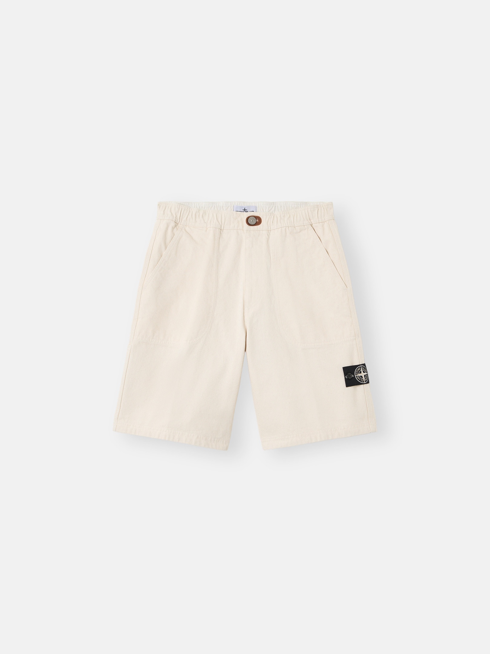 Bermuda shorts made in part with recycled cotton derived from an elaborate recovery and regeneration process that reuses material scraps from the Stone Island production chain. Washed. FABRIC RESEARCH AND TREATMENT The Stone Island Raw Beauty project reuses cotton material scraps from the Stone Island production chain. The scraps selected in the production plants are reprocessed to obtain new blended yarns, containing at least 50% recovered material. The fabrics derived from this elaborate recovery and regeneration process are used for new garments. This garment is made from 60% recycled cotton and 40% conventional cotton. The unbleached fabric features some aesthetic impurities that are typical of raw cotton and should be considered an intrinsic and natural part of the material. Bermuda shorts in cotton gabardine. Washed. STYLE AND FIT Large slanted hand pockets. On back, two patch pockets and one small vertical pocket on right side. White Stone Island fabric research badge on left leg. Inner cotton twill trim at cuffs. Elasticated waistband with inner drawstring. Zipper and button fly; detail inspired by debossed rubber patches of archival Stone Island garments from the 1980s. Loose wide leg fit. COMPOSITION AND CARE External Fabric: 100% Cotton. Pocket Bag: 50% Cotton 50% Lyocell