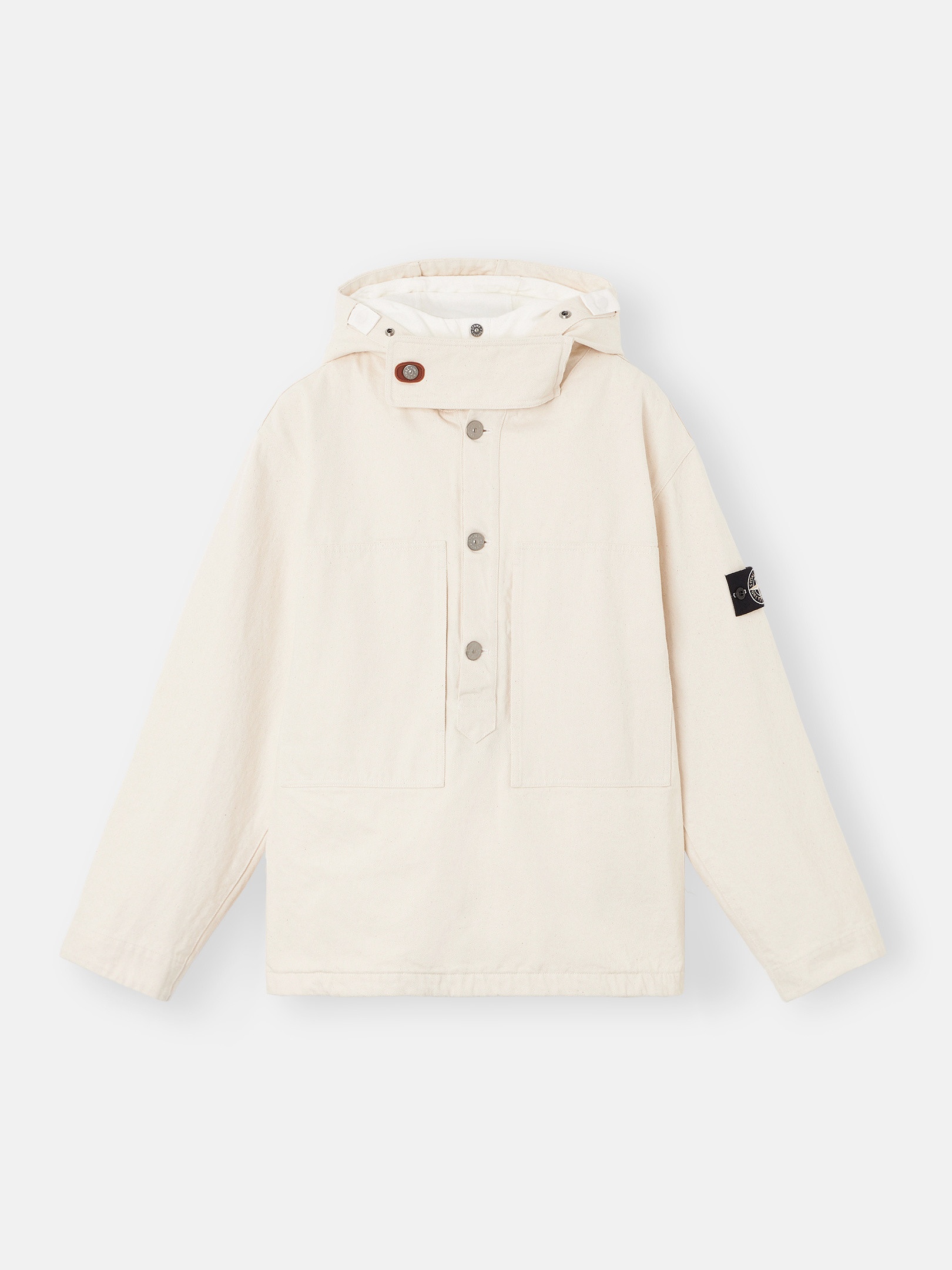 Anorak made in part with recycled cotton derived from an elaborate recovery and regeneration process that reuses material scraps from the Stone Island production chain. Washed. FABRIC RESEARCH AND TREATMENT Anorak in natural cotton gabardine. Washed. The Stone Island Raw Beauty project reuses cotton material scraps from the Stone Island production chain. The scraps selected in the production plants are reprocessed to obtain new blended yarns, containing at least 50% recovered material. The fabrics derived from this elaborate recovery and regeneration process are used for new garments. This garment is made from 60% recycled cotton and 40% conventional cotton. The unbleached fabric features some aesthetic impurities that are typical of raw cotton and should be considered an intrinsic and natural part of the material. Detachable hood lining in cotton canvas and cotton jersey. STYLE AND FIT Hood with cotton tape drawstring that can be fastened with snaps. Chin strap that can also be fastened back onto hood with buttonhole detail inspired by debossed rubber patches of archival Stone Island garments from the 1980s. Three-button neck fastening. Large standing patch chest pockets. Standing on-seam hand pockets. White Stone Island fabric research badge on left sleeve. Button at cuffs with rubber buttonhole detail. Detachable hood lining with snap fastening that can be attached to the outer garment using a system of ties adapted from those used in the sailing world. COMPOSITION AND CARE Garment: 100% Cotton. Hood: 100% Cotton. Hood Padding: 50% Cotton 50% Polylactide / Pla