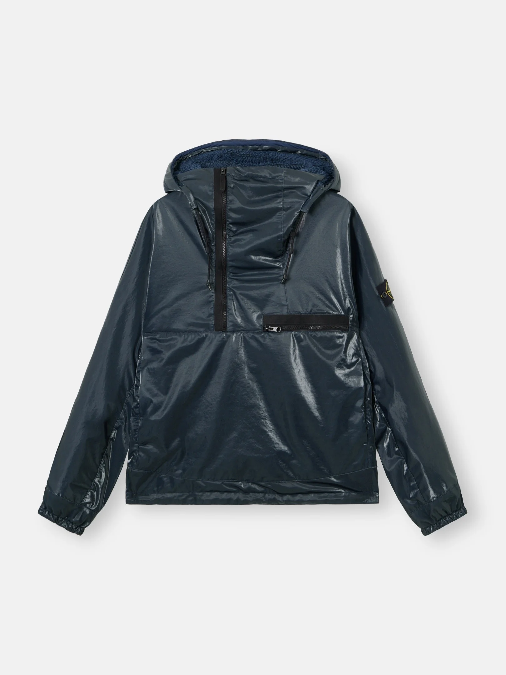 Hooded anorak in stretch nylon, laminated with a polyurethane film that makes it wind resistant, featuring offset zipper and zipper chest pocket. Garment dyed. FABRIC RESEARCH AND TREATMENT Hooded anorak made from a stretch nylon, laminated on the outside with a transparent polyurethane film that makes the fabric resistant to wind. The coating renders the surface smooth and shiny. Garment dyed. STYLE AND FIT Lined hood with drawstring held in place by loops. Offset zipper fastening at high neck with internal gusset. Raglan yoke sleeves. Chest pocket on left side with zipper and tape trim. Standing hand pockets with concealed zipper. Stone Island badge on left sleeve. Elasticated cuffs. Drawcord in bottom hem. COMPOSITION AND CARE External Fabric: 85% Polyamide / Nylon 15% Elastane / Spandex. Coating: 100% Polyurethanic Resin. Lining: 63% Polyester 33% Wool 4% Polyamide / Nylon