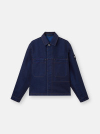 Coach jacket in a 14 oz denim tela woven with indigo-dyed cotton yarn and polypropylene yarn, featuring chest pockets and the Stone Island Denim Research badge. Rinsed. FABRIC RESEARCH AND TREATMENT Polypropylene is one of the lightest fibers in existence, thanks in part to its hollow structure. Even very bulky garments made with this material are surprisingly light. Coach jacket made from a 14 oz denim tela woven with a 3/1 twill weave composed of indigo-dyed cotton yarn and polypropylene yarn. The result is a denim with a traditional appearance, but significantly lighter in weight. The finished garment is rinsed. STYLE AND FIT Yoke on front. Patch chest pockets with concealed snap. One internal standing chest pocket. Stone Island Denim Research badge with metal buttons on left sleeve. Button at cuffs with small star embroidery above right sleeve placket. Hidden button fastening inside double placket with one visible button at collar. COMPOSITION AND CARE 56% Cotton 44% Polypropylene