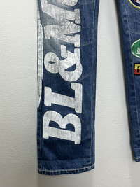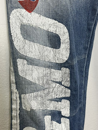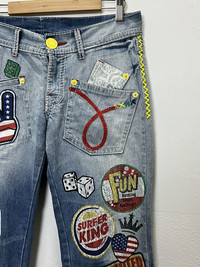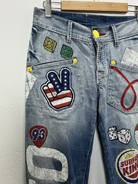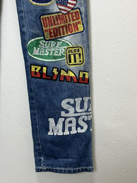BLUE MOON BLUE SURFMASTER Full Printed Jeans American peace sign, dice, Lego block, and other pop-art style designs ➤ BRAND NAME : BLUE MOON BLUE MADE IN CHINA ......…................................................................ ➤ SIZE MANUAL MEASUREMENT / LAID FLAT (INCHES) WAIST : 13“(W26"). - Size on Tag LENGTH ; *Outseam : 38.5" *Inseam : 30" .......….............................................................. ➤✈️WORLDWIDE EXPRESS SHIPPING ✈️ DHL / FedEx (ETA) 5~8 Days Worldwide (From Asia) THANK YOU VERY MUCH HAPPY SHOPPING