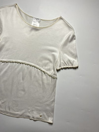 CHANEL 2016 Pearl Embellished Short Sleeve Top - Cream Size: 34 Width: 15” Length: 22” Shoulder: 17” Sleeve Length: 7.5” Waist: 14” Hem: 17” measured in inches Condition: Excellent condition with signs of use Flaw: Barely visible dirt stain (washable) An incredibly elegant piece from Chanel’s 2015/2016 collection (Ref: P52712V33521). This cream-colored short-sleeved top features a sophisticated empire waist and sleeve hems lined with delicate faux pearl trim. It includes a signature CC logo pearl charm detail at the lower left hem, adding a subtle touch of luxury. Made in Italy 57% Viscose - Rayon 43% Cotton ATTENTION: Check the measurements carefully! Tag sizes may be inaccurate due to wear, alterations, or vintage sizing. For the best fit, compare our measurements with a similar item that fits you well. * 📦 Shipping via DHL express From Philippines with Tracking Number * ETA: 3-5 days ALL SALES ARE FINAL THANKYOU!