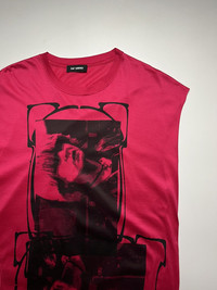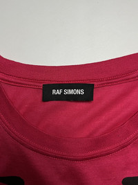 Archive Raf Simons SS19 Runway Displaced Deconstructed Portrait Tee Size: Small Width: 21” Full Length w/ Bottom Sleeve: 38” Shoulder: 21” Sleeve Length: 8” Hem: 22” measured in inches Condition: Excellent Condition Flaw: None Tagged Size OS (One Size). Due to the displaced construction, this piece fits anywhere from a Medium to an XL depending on the desired drape. It is intended to fit boxy and asymmetric. A quintessential example of Raf Simons’ obsession with subculture, DIY aesthetics, and deconstructed tailoring. This piece debuted on the SS19 runway, which featured a heavy focus on high-glance satins, punk-inspired graphics, and experimental silhouettes. This "Tabard" style top features a unique double-neck construction, allowing it to be worn in various draped configurations. It is cut from a premium, mid-weight cotton with a slight sheen, characteristic of the SS19 collection’s "Duchesse" satin influence. The front features a high-contrast, punk-style photographic print framed in a classic Raf-styled border. Made in Italy 100% Cotton ATTENTION: Check the measurements carefully! Tag sizes may be inaccurate due to wear, alterations, or vintage sizing. For the best fit, compare our measurements with a similar item that fits you well. * 📦 Shipping via DHL express From Philippines with Tracking Number * ETA: 3-5 days ALL SALES ARE FINAL THANKYOU!
