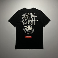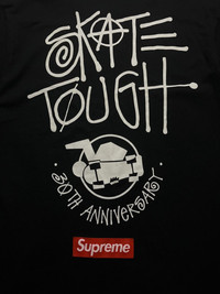 Stüssy × Supreme “Skate Tough” 30th Anniversary Tee (2010) Size: Small Width: 19” Length: 28” Shoulder: 17” Sleeve Length: 9” Hem: 19 measured in inches This is the Stüssy × Supreme collaborative “Skate Tough” 30th Anniversary Tee, released in 2010 to celebrate Stüssy’s 30 years in the skatewear game. It features a bold, hand‑drawn “Skate Tough” graphic with a miniature skateboard and the classic red Supreme box logo stamped below. A true collector’s piece—crafted in heavyweight black cotton, this tee bears the iconic white graphic across the back. Despite its decade-plus age, the print remains crisp and the fabric retains integrity (small vintage character marks/stains are typical). The tee comes in a washed Medium (may fit closer to Large after wear). A rare gem for vintage Supreme/Stüssy fans, blending mellow streetwear heritage with archival appeal. This collab is considered extremely rare—one Reddit user noted it’s “very difficult to find for sale” nearly 10 years after release . Its scarcity has only increased over time, making it a highly sought-after archival piece. ATTENTION: Check the measurements carefully! Tag sizes may be inaccurate due to wear, alterations, or vintage sizing. For the best fit, compare our measurements with a similar item that fits you well. * I will not accept return if u can't fit it. As I already gave my manual measurement. Please enlarge the photos for clearer image * please be careful before buying be a smart buyer * 📦 Shipping via DHL express From Philippines with Tracking Number ALL SALES ARE FINAL THANKYOU!