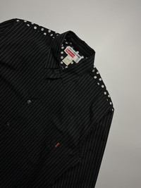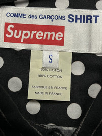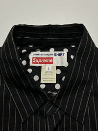 Supreme x COMME des GARÇONS Pinstripe polka dot Button-Up Size: Small Width: 21” Length: 30” Shoulder: 18” Sleeve Length: 23.5” Hem: 22” Flaw: None Excellent Condition Made in France 100% Cotton This rare Supreme x Comme des Garçons SHIRT long-sleeve button-up is a standout piece from one of their highly sought-after collaborations. The shirt features a unique contrast design: the front is adorned with classic black pinstripes on a dark base, while the back panel boldly showcases an all-over polka dot pattern. This mix of traditional and playful elements captures the signature avant-garde aesthetic of CDG, paired with Supreme’s streetwear edge. ATTENTION: Check the measurements carefully! Tag sizes may be inaccurate due to wear, alterations, or vintage sizing. For the best fit, compare our measurements with a similar item that fits you well. * I will not accept return if u can't fit it. As I already gave my manual measurement. Please enlarge the photos for clearer image * please be careful before buying be a smart buyer * Shipping via DHL express with Tracking Number ALL SALES ARE FINAL THANKYOU!