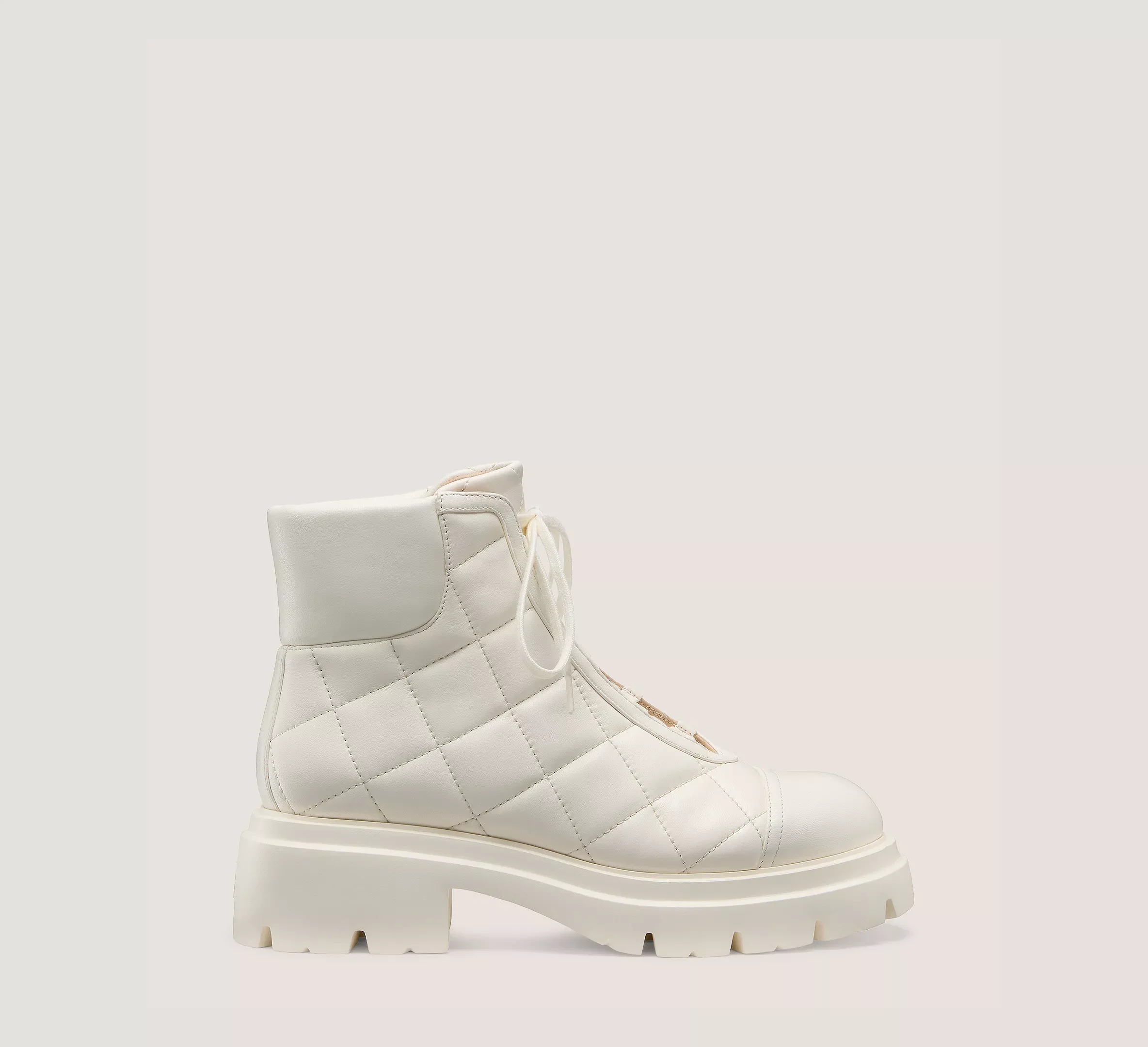 EDITOR'S NOTES The HUDSON QUILTED HIKER BOOTIE is crafted with a quilted upper that creates a stylish juxtaposition against its rugged silhouette. This made-in-Spain lace-up boot rests on a lug sole complete with a 20-mm block heel for an extra lift. PRODUCT DETAILS MEASUREMENTS Heel Height: 2", 50 mm Shaft Height: 4.7", 12 cm Shaft Circumference: 10.2", 26 cm All measurements are made on a size 6 shoe. There may be slight measurement variations based on size. FEATURES Bootie Ankle Flat block heel Round toe Lace-up Quilted upper Lug sole MATERIALS Quilted Nappa Leather Leather insole Rubber outsole MADE IN Spain