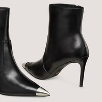 EDITOR'S NOTES The STUART CAPSIZE 85 ZIP BOOTIE offers a daring twist on our signature sharp ankle boot silhouette. Note its contrasting metallic toe cap detail — while eye-catching, this ultra-sleek design remains versatile enough to wear for day or night, with everything in your closet. This style I crafted in Spain by our artisans on an 85-mm slightly curved stiletto heel and finished with a side zipper that enables it to be slipped on and off with ease. PRODUCT DETAILS MEASUREMENTS Heel Height: 3.4", 85 mm Shaft Height: 10.6", 27 cm Shaft Circumference: 5.5", 14 cm All measurements are made on a size 6 shoe. There may be slight measurement variations based on size. FEATURES Bootie Ankle Stiletto heel Pointed toe Side zipper Contrasting metallic toe cap Part of the STUART Collection MATERIALS Nappa leather & metal Leather insole Leather outsole