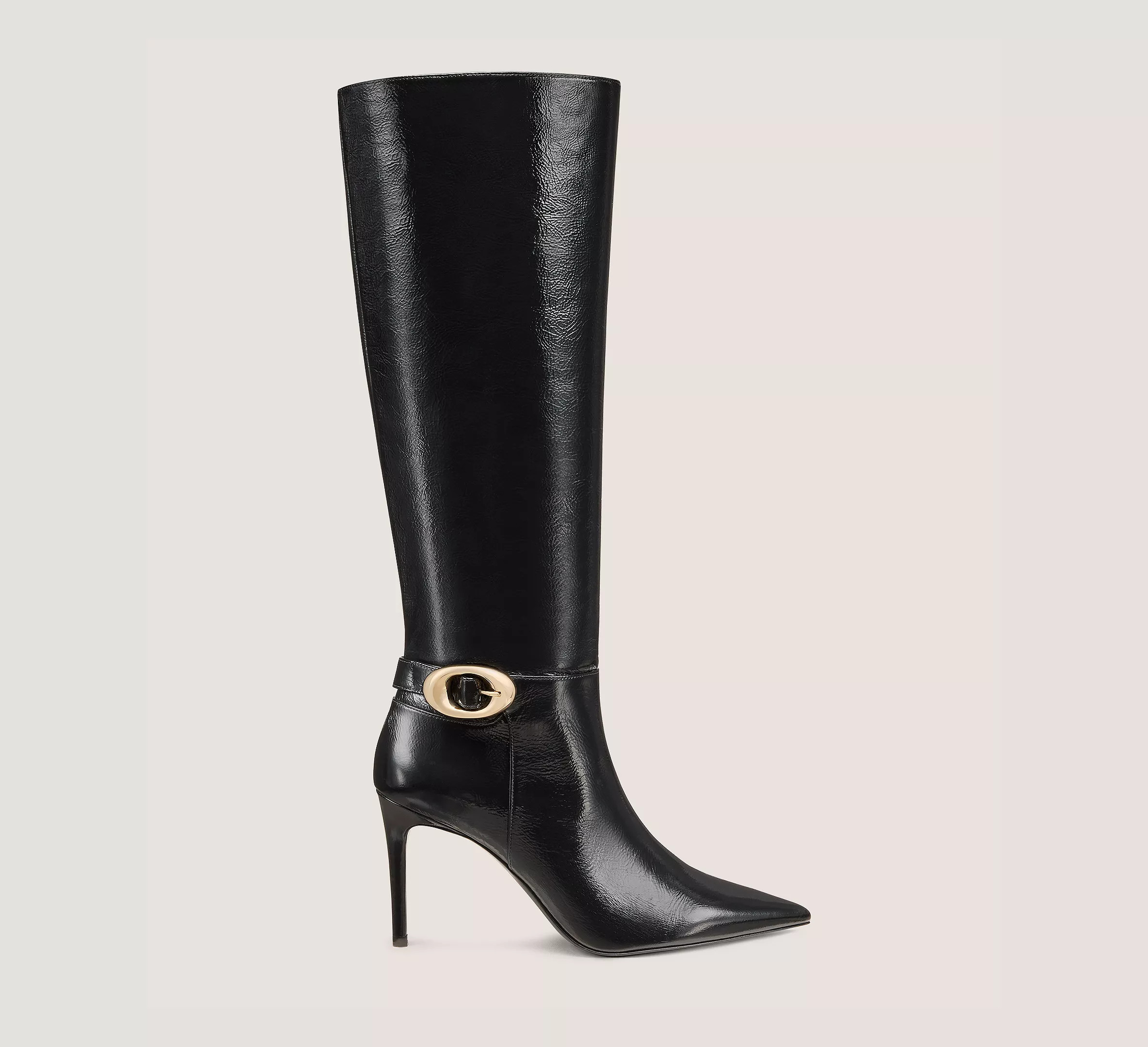 EDITOR'S NOTES The STUART POWER BUCKLE BOOT offers a polished take on our iconic pointed-toe STUART boot design. This ultra-sleek knee-high boot is crafted in Spain with an oversized buckle detail and a 75-mm stiletto heel. PRODUCT DETAILS MEASUREMENTS Heel Height: 3.4", 85 mm Shaft Height: 15", 38 cm Shaft Circumference: 15", 38 cm All measurements are made on a size 6 shoe. There may be slight measurement variations based on size. FEATURES Boot Knee-high Stiletto heel Pointed toe Buckle detail Modernized construction for extra support New foam insole Crafted by SW artisans in Spain A Stuart Weitzman icon Part of the iconic STUART Collection MATERIALS Crinkled Patent Leather Leather insole Leather outsole