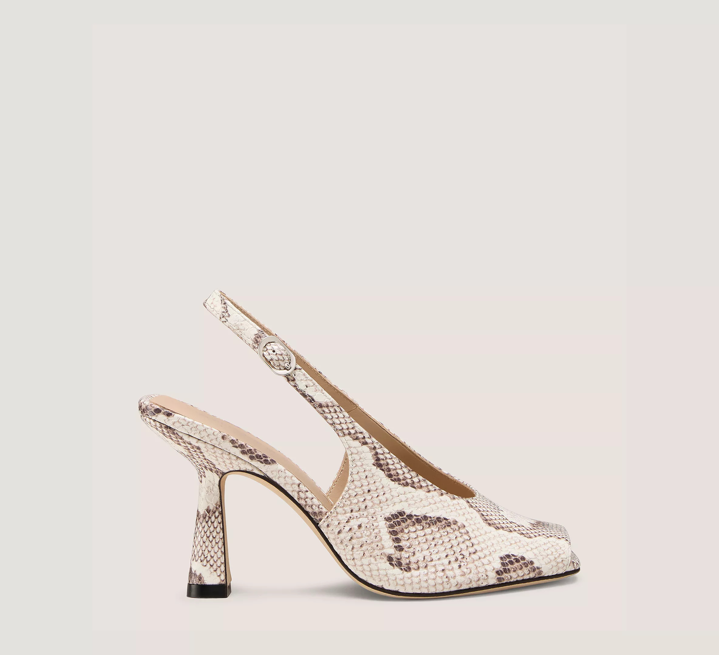 EDITOR'S NOTES The VAL SLINGBACK 85 taps into this season's peep-toe trend — with a decidedly modern twist. Defining features of this made-in-Spain style include its sleek, 85-mm sculptural heel, higher-coverage vamp design and square toe. PRODUCT DETAILS MEASUREMENTS Heel Height: 3.4", 85 mm All measurements are made on a size 6 shoe. There may be slight measurement variations based on size. FEATURES Pump Sculptural heel Rounded square-toe Peep-toe Adjustable slingback strap MATERIALS Snake Printed Leather Leather insole Leather outsole